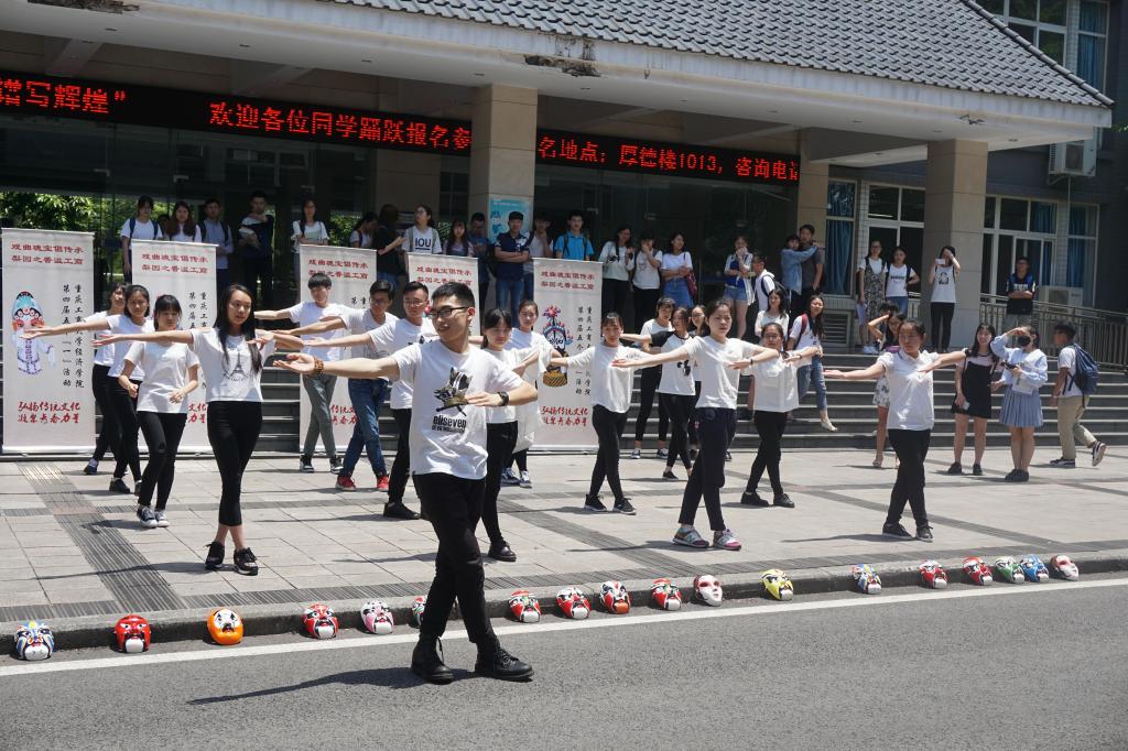 “第一套戏曲广播体操现在开始……”腕花小云手、单拉山膀、弓箭步,5月17日,365英国上市官网兰花湖片区和南岸校区,30多名活力四射的大学生整齐划一地跳起了戏曲广播操,动感的音乐配上健美、灵动的身段,引得大量过往师生驻足观看,让人眼前一亮。同学们表演的是中国有史以来第一套“戏曲广播体操”,戏曲操创新性的把戏曲程式化动作融入到大众健身理念,以流行动感的音乐配合优美的戏曲基本功动作,2017年1月一经推出便刷爆...