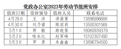为更好地服务全校师生,保障劳动节期间学校相关工作顺利开展,党政办公室已安排值班人员,负责学校校章、党委印章、法人印章、学校合同章、党政办公室印章等用印,学校介绍信开具,公文签发审核,会议室申请及使用等工作,请需求单位或师生按规定流程履行签批手续,其他未尽事宜,请与值班老师联系。