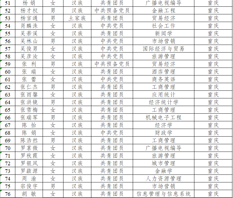 按照重庆市西部计划项目办的统一部署和安排,经学生本人报名、各学院推荐、校团委审核、重庆市各区县项目办招募考核等环节,根据市项目办的反馈,365官网入围2023年西部计划市内服务共104人,现将名单公示如下: