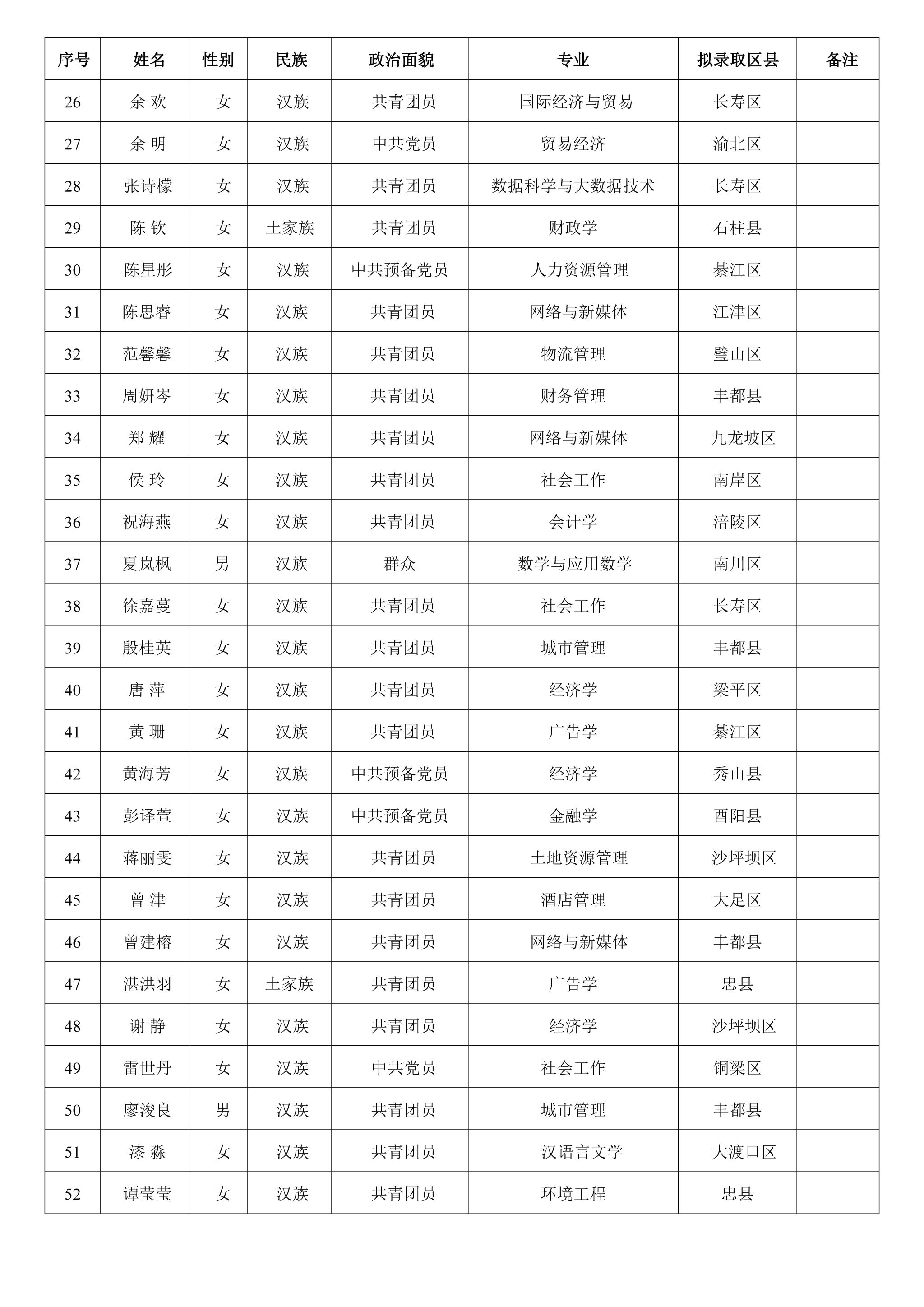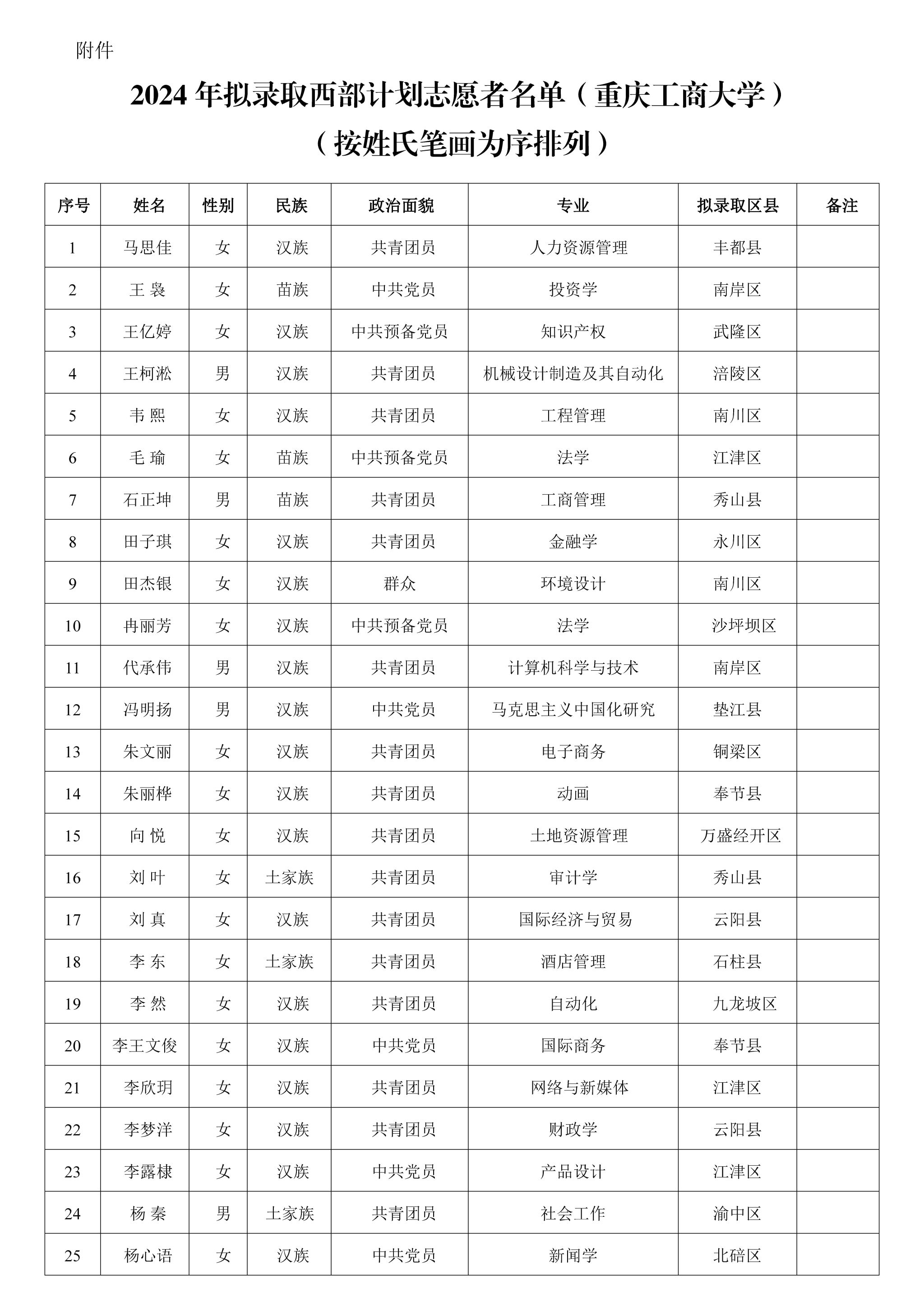 按照重庆市西部计划项目办的统一部署和安排,经学生本人报名、各学院推荐、校团委审核、重庆市各区县项目办招募考核等环节,根据6月5日市项目办反馈情况,现将365官网2024年赴市内参与西部计划服务拟录取名单公示如下:(共52名,按姓氏笔画为序排列)