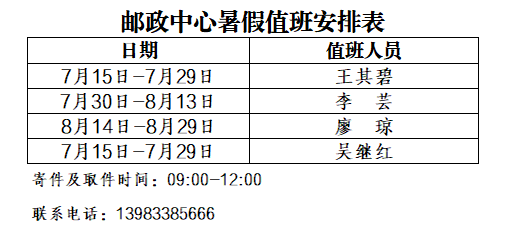 为更好地服务全校师生,保障暑假期间学校相关工作顺利开展,党政办公室每天均安排值班人员,负责学校校章、党委印章、法人印章、学校合同章、党政办公室印章等用印,学校介绍信开具,公文签发审核,会议室申请及使用等工作,请需求单位或师生按规定流程履行签批手续,其他未尽事宜,请与值班老师联系。
