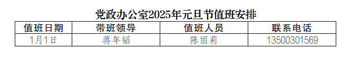 为更好地服务全校师生,保障元旦节期间学校相关工作顺利开展,党政办公室均安排值班人员,负责学校校章、党委印章、法人印章、学校合同章、党政办公室印章等用印,学校介绍信开具,公文签发审核,会议室申请及使用等工作,请需求单位或师生按规定流程履行签批手续,其他未尽事宜,请与值班老师联系。