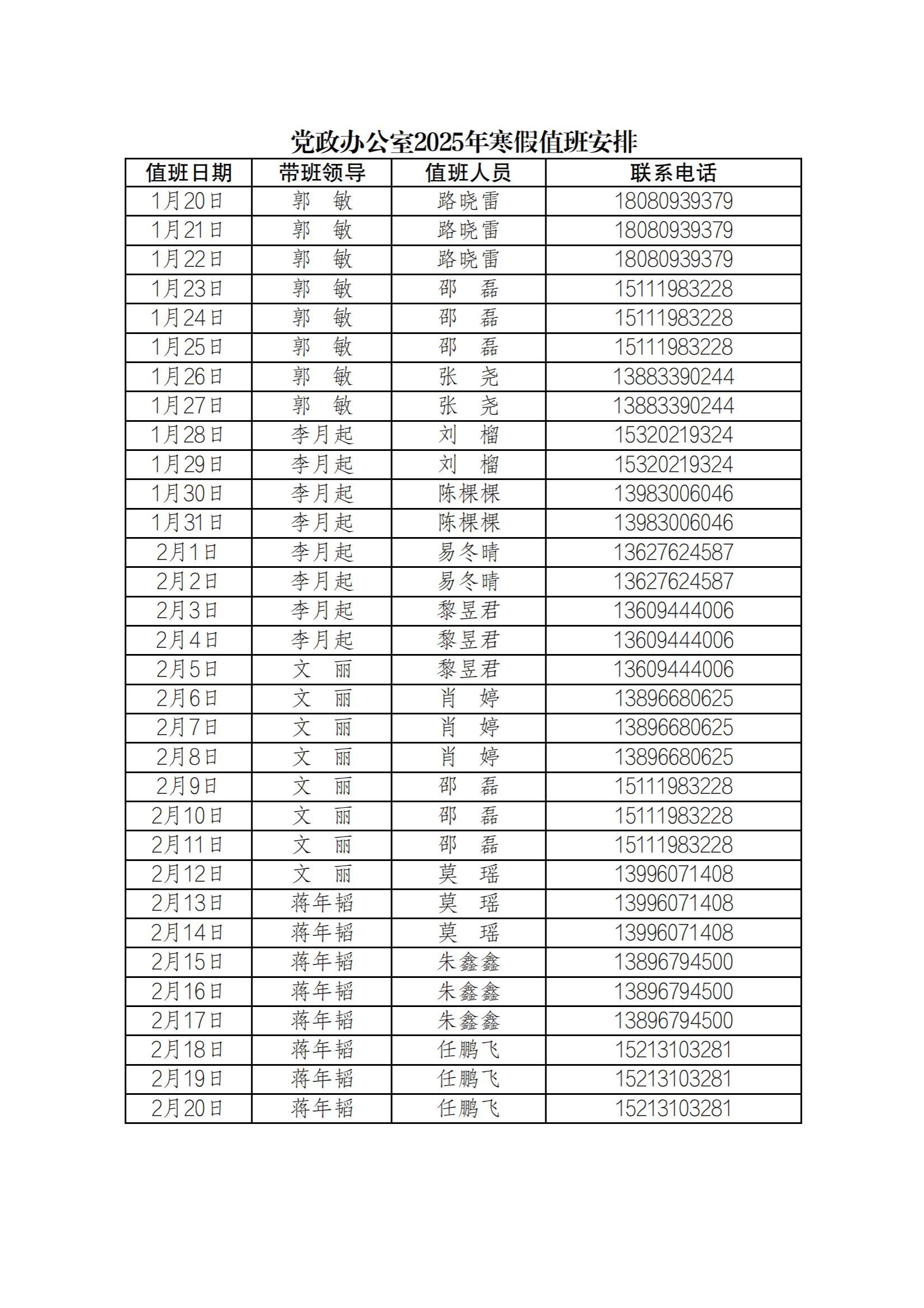 为更好地服务全校师生,保障寒假期间学校相关工作顺利开展,党政办公室每天均安排值班人员,负责党委印章、学校校章、法人印章、学校合同章、党政办公室印章等用印,学校介绍信开具,公文签发审核,会议室申请及使用等工作,请需求单位或师生按规定流程履行签批手续,其他未尽事宜,请与值班老师联系。