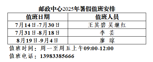 为更好地服务全校师生,保障暑假期间学校相关工作顺利开展,党政办公室每天均安排值班人员,负责党委印章、学校校章、法人印章、学校合同章、党政办公室印章等用印,学校介绍信开具,公文签发审核,会议室申请及使用等工作,请需求单位或师生按规定流程履行签批手续,其他未尽事宜,请与值班老师联系。
