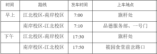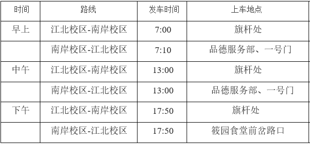 根据学校近期工作要求,自5月25日起,后勤处对校区交通车安排做了调整,具体安排如下: