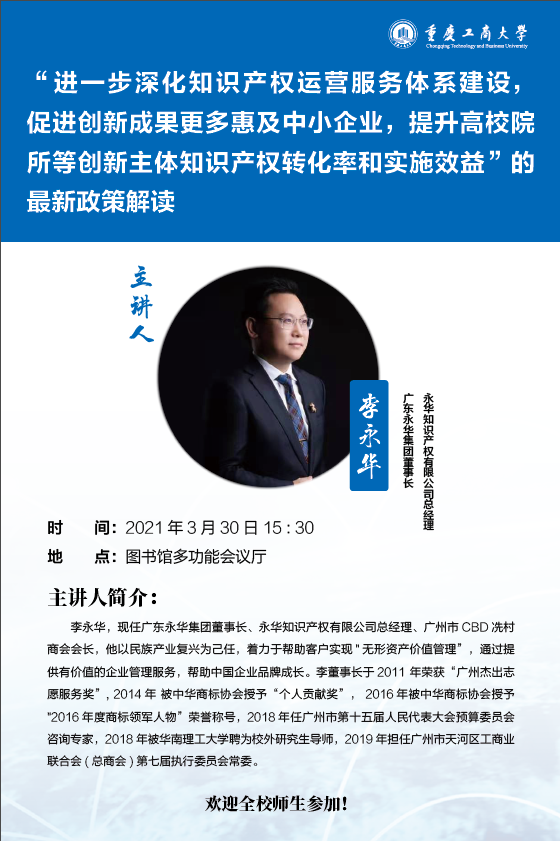 为推进知识产权强校建设,促进365官网科技创新,加快科技成果的转化,为广大师生开展创新活动提供更好、更专业的服务,365英国上市官网科技成果转化中心和会计学院共同举办“进一步深化知识产权运营服务体系建设,提升高校院所等创新主体知识产权转化率和实施效益”的最新政策解读讲座,现将有关事项通知如下: