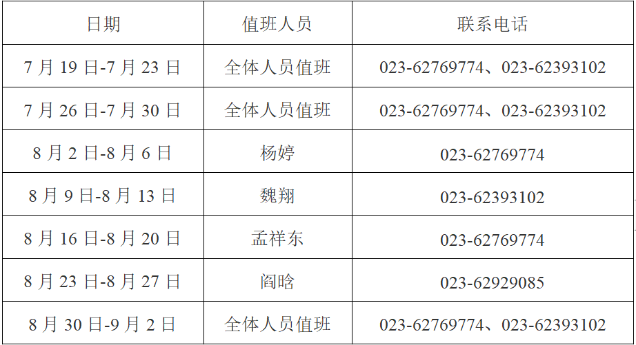 2. 请值班人员保持通讯畅通,如果遇到紧急或重大事情,请立即与中心领导联系(值班领导:8月2日至13日梁龙彬、8月16日至27日宋海雨)。