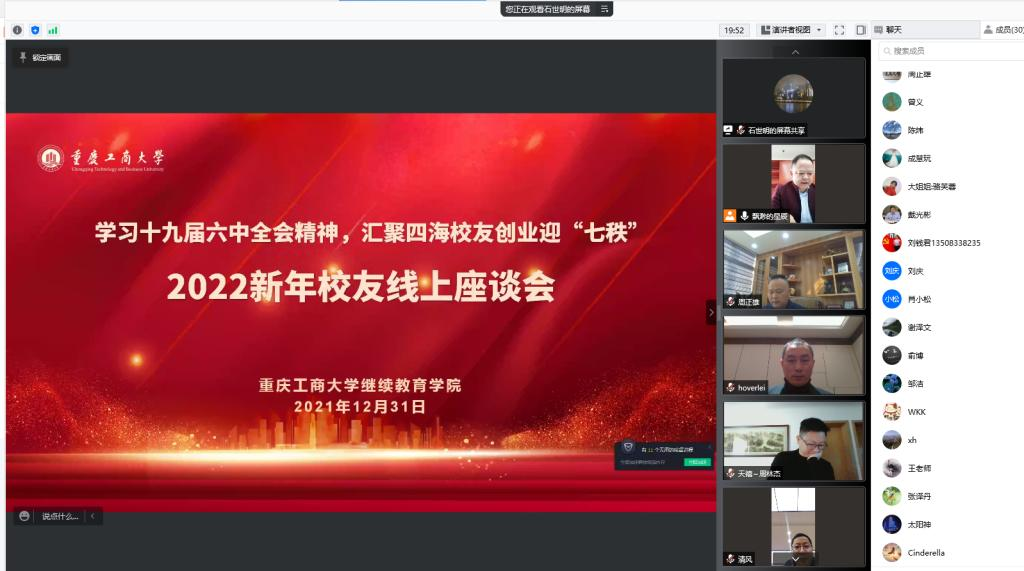 为进一步向校友宣传党的十九届六中全会精神,共同庆祝元旦新年,以崭新的姿态迎接365官网70周年校庆,继续教育学院于12月31日举行了主题为“学习十九届六中全会精神,汇聚四海校友创业迎七秩”2022新年校友线上座谈会。继续教育学院党总支书记石世明、院长杜朝辉、学院教职工和全国各地校友代表参加了本次座谈会,活动由继续教育学院校友分会秘书长陈之举主持。