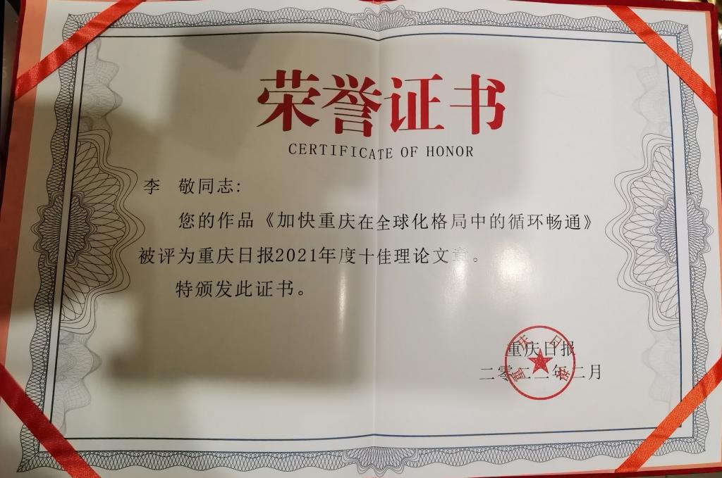 李敬教授的理论文章《加快重庆在全球化格局中的循环畅通》围绕双循环新发展格局,深入分析了重庆作为内陆开放高地要充分发挥通道优势、抓住重大机遇、完善制度体系,实施更大范围、更宽领域、更深层次的对外开放,促进全球化格局中的循环畅通,对加快重庆在全球化格局中的循环畅通具有现实借鉴意义,入选“重庆日报2021年度十佳理论文章”。易淼教授获评“重庆日报基层理论调研基地特聘专家”。座谈会上,曾维伦、李保海、张永才分别为十佳理论文章作者、十佳理论作者、基地特聘专家颁发证书。