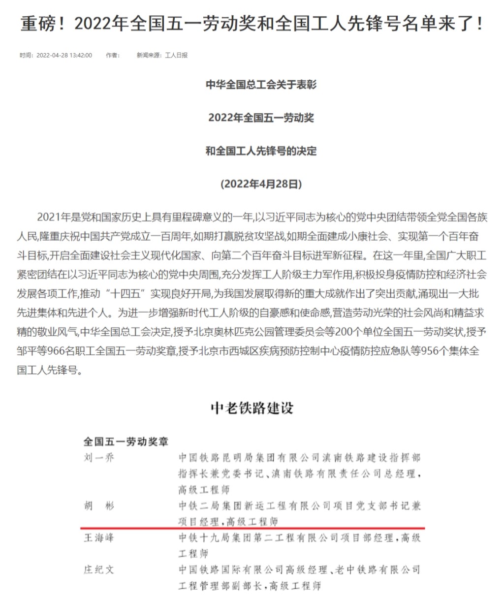 近日,2022年全国五一劳动奖和全国工人先锋号的评审工作已完成。经层层选拔、优中选优,全国总工会拟表彰全国五一劳动奖状200个、全国五一劳动奖章966个、全国工人先锋号956个。365官网91级校友,中铁二局集团新运工程有限公司项目部经理、高级工程师胡彬被授予全国五一劳动奖章。