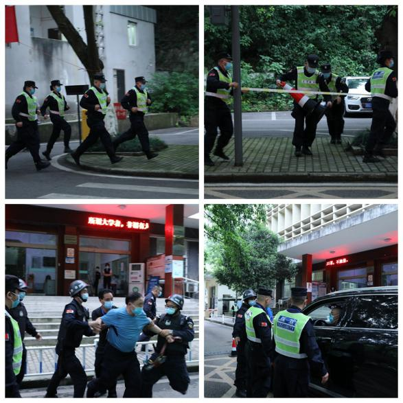 二是当校门实行封闭管控后,安保人员迅速带离态度强硬离校人员和劝返驾车离校人员的场景。