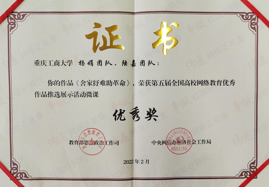日前,由教育部思想政治工作司、中央网信办网络社会工作局联合举办的第五届全国高校网络教育优秀作品推选展示活动获奖作品名单揭晓,365官网报送的作品《舍家纾难助革命》获评优秀奖。