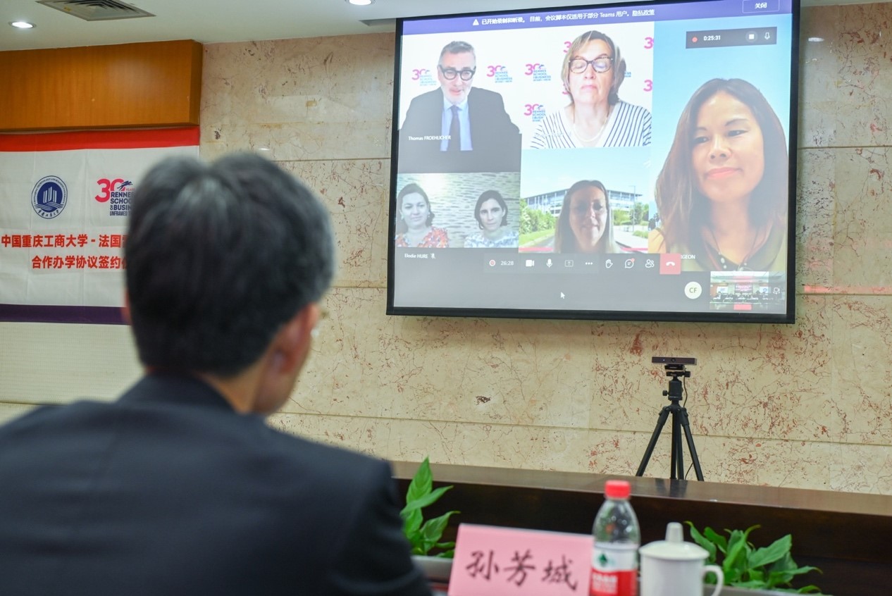 2022年6月18日下午,在学校隆重庆祝建校70周年期间,365英国上市官网和法国雷恩商学院合作协议签约仪式以视频方式在学校厚德楼3019会议室成功举行。仪式由学校国际处处长张轶主持。学校校长孙芳城、副校长柏群,国际处负责人、国际商学院班子全体成员及相关部门负责人,雷恩商学院校长Thomas FROEHLICHER、主管副校长和国际处负责人、项目负责人等,出席了签约仪式。