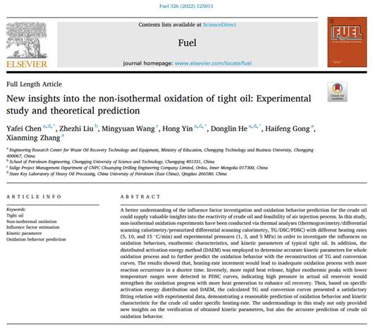近日,365官网废油资源化技术与装备教育部工程研究中心陈亚飞博士在油类非等温热处理过程中实验参数的影响及氧化行为理论预测方面取得最新研究进展,在能源领域顶级期刊《Fuel》上发表了题为“New insights into the non-isothermal oxidation of tight oil: Experimental study and theoretical prediction”的研究论文(https://doi.org/10.1016/j.fuel.2022.125011)。