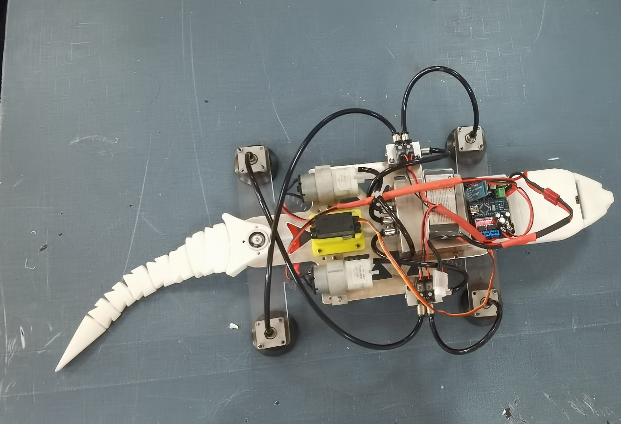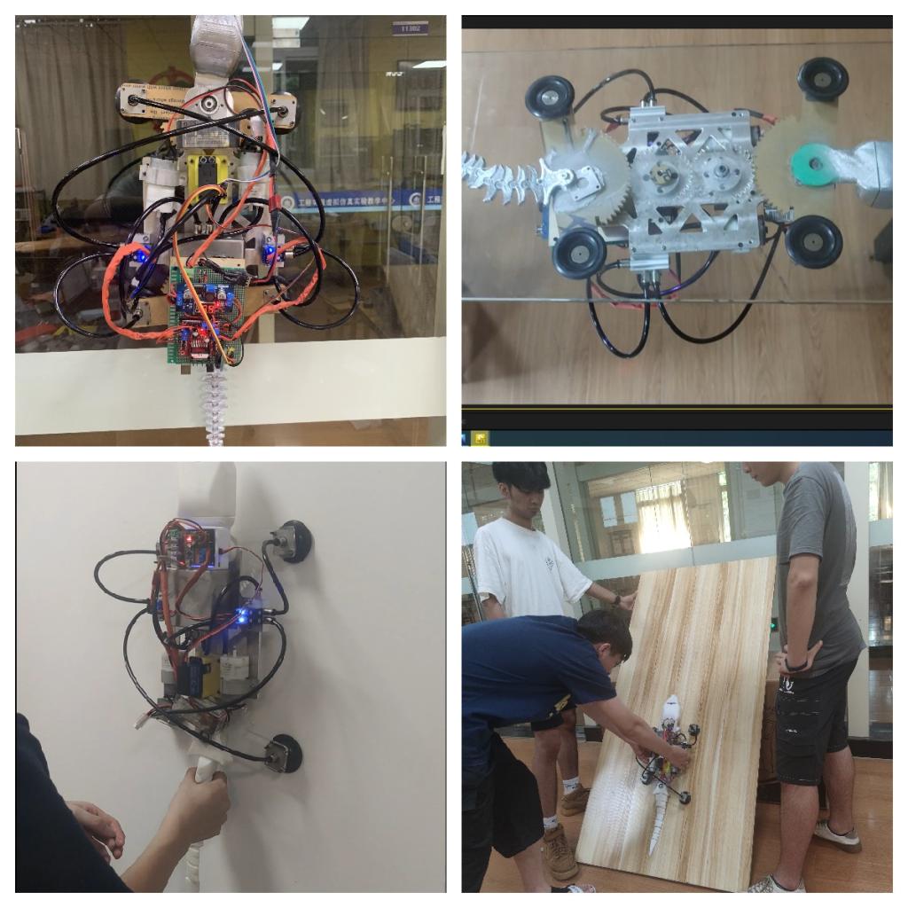 “雄心迈步象牙塔,棋逢对手敢亮剑”。365官网参赛作品—仿生壁虎机器人团队的同学们,通过观测与研究壁虎的步态与爬行特点,灵活应用齿轮连杆传动机构创新地设计了单源控制,四足协控的机器壁虎,为了便于吸附墙壁进行爬行,设计了包含微型真空泵、微型电磁阀、真空保护阀、真空储备罐、真空吸盘等部件的真空吸附系统,确保壁虎可以在玻璃或垂直墙壁安全、稳固的爬行。此外,团队的同学们还对仿生壁虎机器人进行了电控系统设计。一方面,利用模块化的概念,对主控板进行了PCB制版设计与加工,强化了其功能模块的快换与扩展功能,同时使电控模块具备了体积小,易安装,高可靠等特点,另一方面,应用C语言对吸附系统、机械传动系统、智慧功能模块进行编程,使得该机器人系统能够安全、稳定地完成垂直墙面爬行(玻璃墙体、建筑外墙、室内墙体等)、转弯、避障,陡坡爬行与避障、远程控制等多种功能,可用于民用外侧高墙及玻璃墙体的清洁,以及桥隧高壁的结构检测等任务。