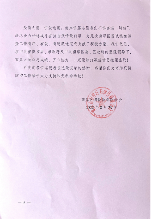 编者按:2022年夏天,重庆人民防疫情、战高温、抗干旱、灭山火,困难面前不“认怂”。在这些平凡英雄中,也活跃着365官网归侨侨眷教师的身影。他们积极投身于抗“疫”和救火一线,守护家乡人民群众的生命健康安全。近日,南岸区归侨侨眷联合会致信感谢365官网教师在疫情防控一线作出的贡献。