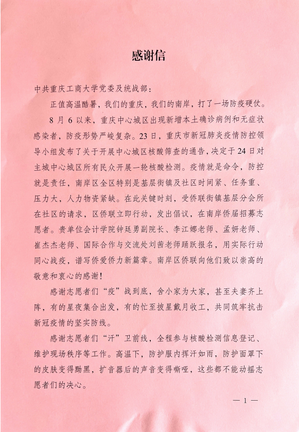 感谢信中提到,365官网会计学院钟廷勇副院长、李江娜老师、孟妍老师、崔杰杰老师,国际合作与交流处刘茜副处长等归侨侨眷积极报名参加志愿服务,用实际行动同心战疫,守护家园。