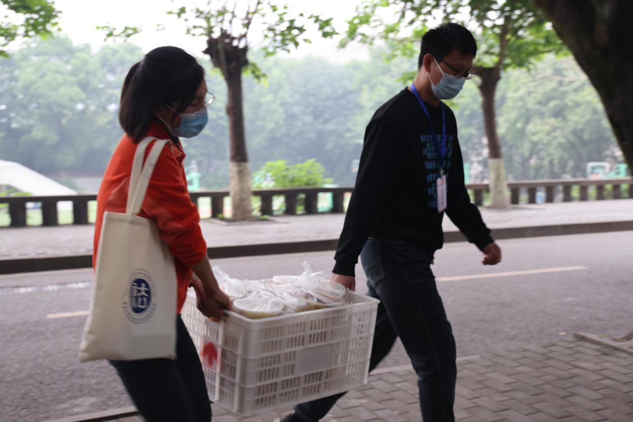 睁眼起床后,辅导员们第一件事情便是打开手机查看工作群的最新消息和学生反映情况的短信。“我现在恨不得一天24小时每分每秒都盯着屏幕”作为学生在学校最亲近的人,辅导员们深知“睁眼手机,闭眼手机”将会是这段时间的生活常态。整理内务后,顾不上吃饭,辅导员们化身学生的“跑腿员”,组成“盛饭大军”“送餐天团”,奔走于食堂与学生寝室之间。早餐配送结束后,辅导员们不忘分享送餐感想,“在这个时候,还能和孩子们简单说几句相互鼓励的话,让我感觉很开心很温暖,与其说我在帮助孩子们,不如说孩子们在鼓励我。”