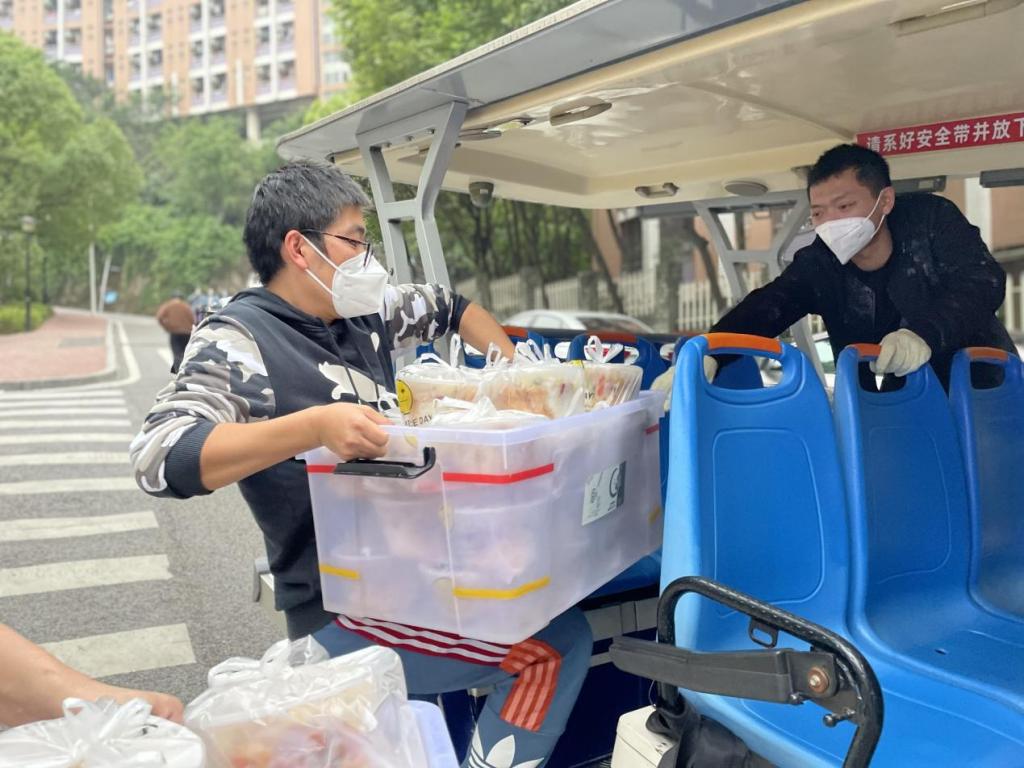 快到晚餐时刻,辅导员们又马不停蹄地赶往食堂,与后勤人员对接,化身为学生的“服务员”,帮助食堂一起打包餐食,然后再送去各个楼栋,“我们的任务就是要让每一个孩子都能够尽量早点吃上饭菜。”“加快脚步,让学生吃上热乎的!”