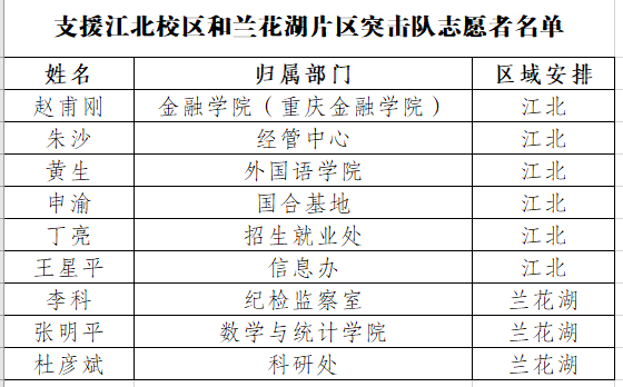11月23日,学校党委紧急研究部署,决定成立疫情防控突击队,支援江北校区和兰花湖片区的疫情防控工作。随后,迅速面向正在南岸校区住校抗疫办公的党员干部职工发出志愿者征集令。号令一出,广大教职工踊跃报名,很快,由9名党员干部职工组成的疫情防控突击队迅速集结待命。