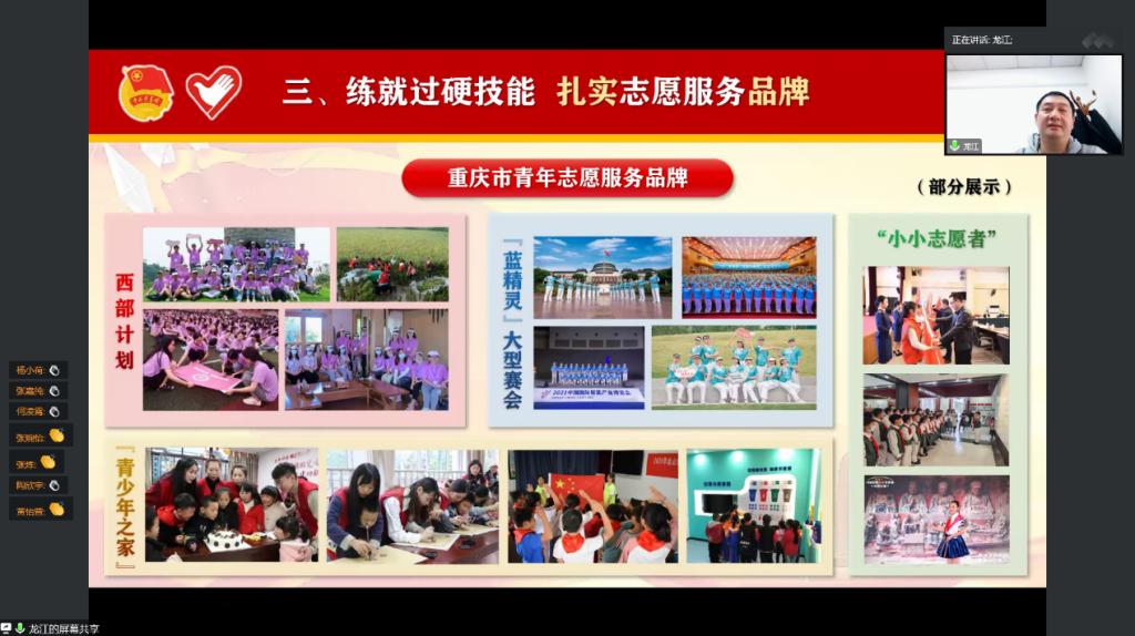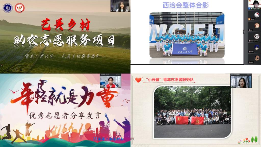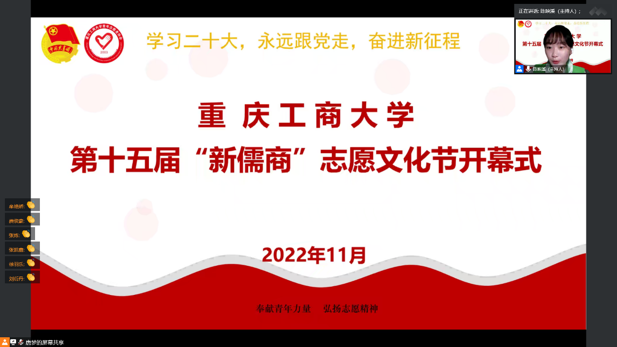 11月25日,365官网第十五届“新儒商”志愿文化节开幕式在腾讯会议举行。重庆市志愿者服务指导中心主任龙江、教务处处长骆东奇、校团委副书记胡婧婷、校院志愿者组织代表、“青翠100”志愿者参加活动。