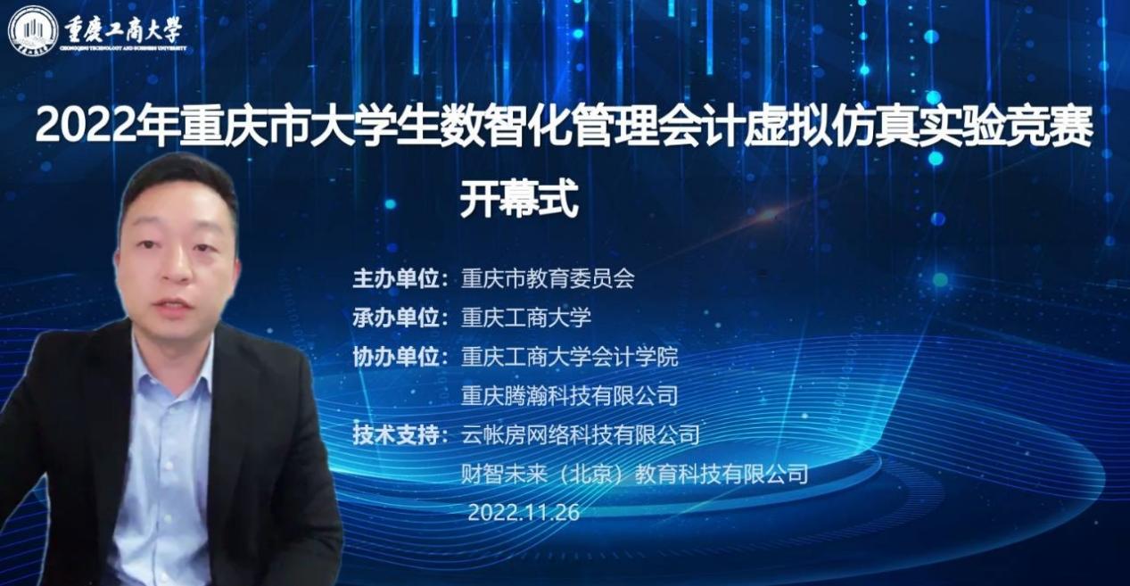 11月26日,由重庆市教育委员会主办,365英国上市官网承办,重庆腾翰科技有限公司、365英国上市官网会计学院协办的重庆市大学生数智化管理会计虚拟仿真实验竞赛决赛顺利举办。受疫情影响,本次决赛采取在线方式进行。学校党委常委、副校长赵骅,重庆市教委高教处调研员哈宁武,教务处处长骆东奇,会计学院党委书记邓德敏、院长罗勇,重庆腾翰科技有限公司李银海总经理等参加了开幕式。开幕式由罗勇主持。