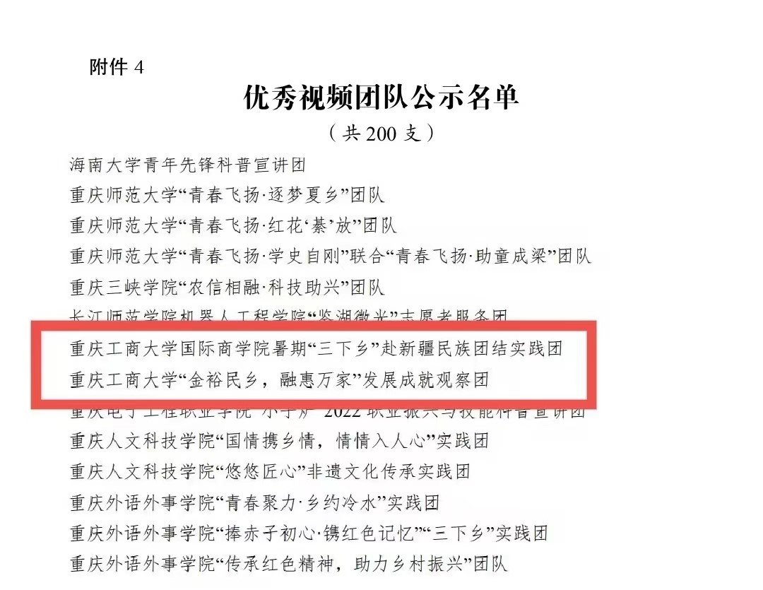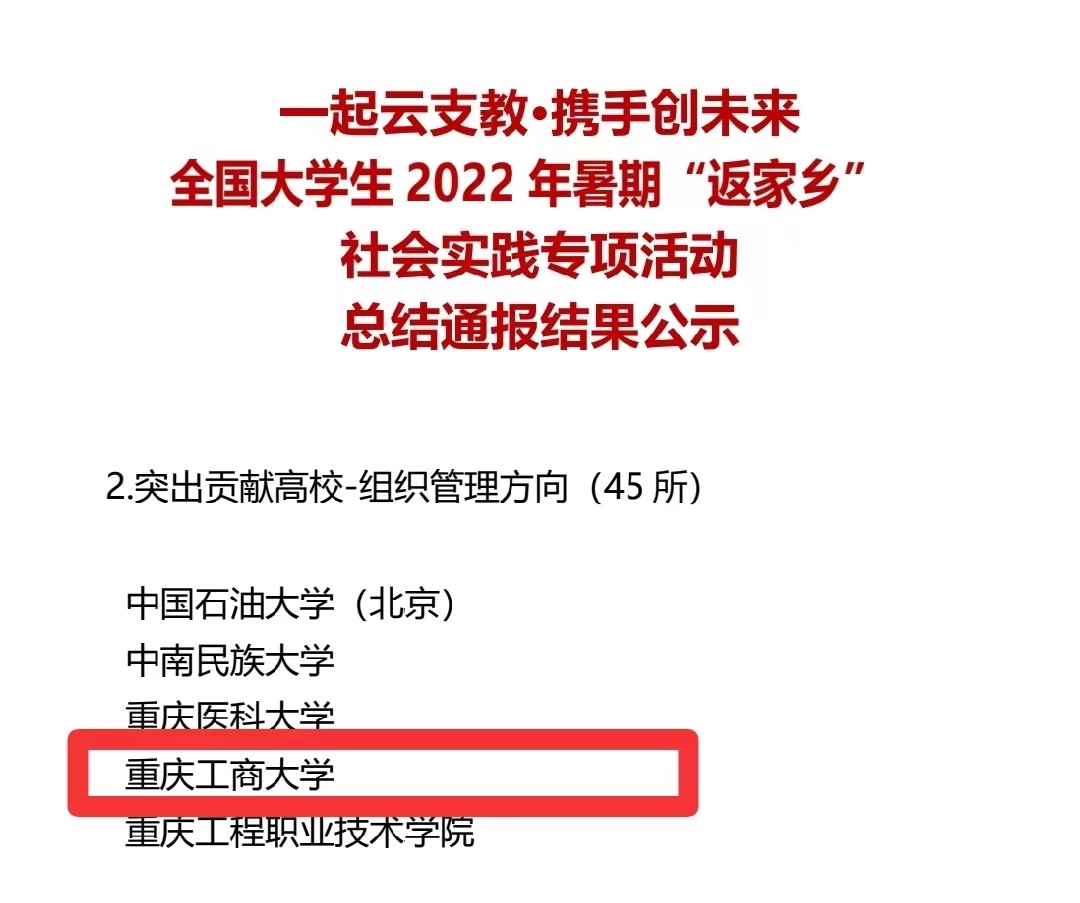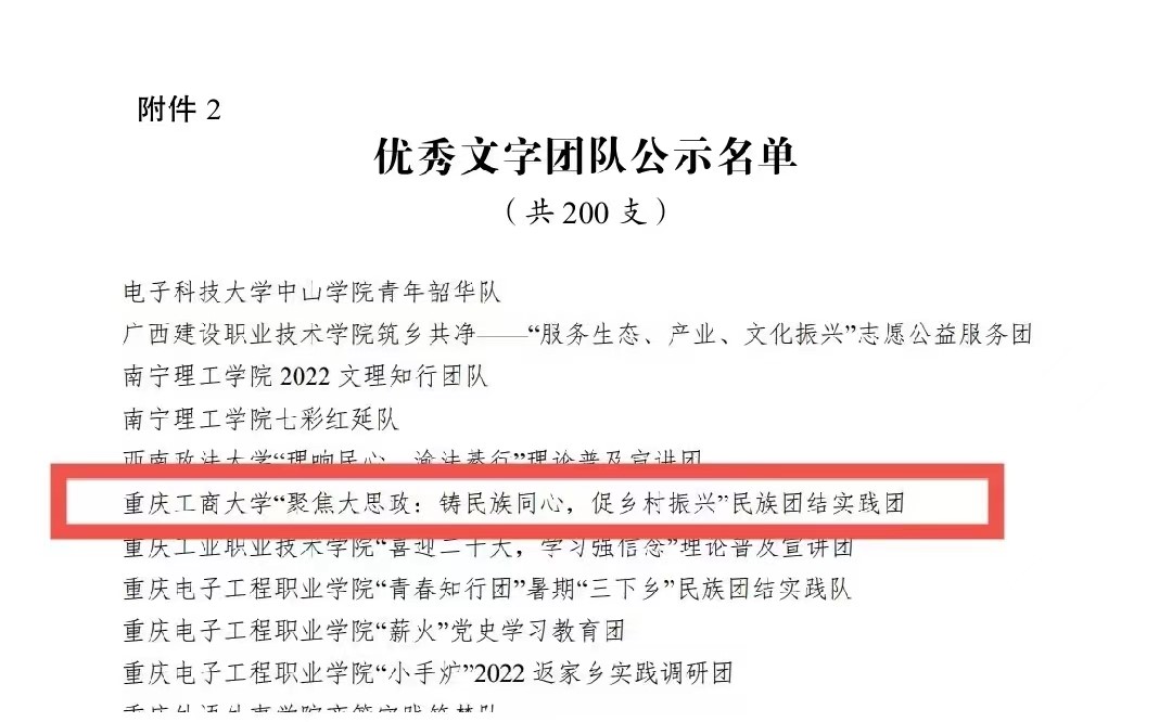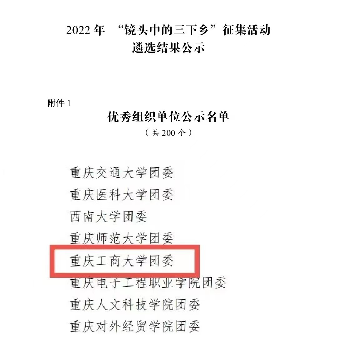 在中央宣传部、中央文明办、教育部、共青团中央、全国学联共同举办的2022年全国大中专学生志愿者暑期文化科技卫生“三下乡”社会实践活动评选中,365官网金融学院“金裕民乡,融惠万家”发展成就观察团荣获2022年“三下乡”社会实践活动全国优秀团队。在共青团中央青年发展部、中国青年报、中国青年网共同举办的2022年“镜头中的三下乡”征集活动中,校团委荣获“全国优秀组织单位”奖项,金融学院“金裕民乡,融惠万家”发展成就观察团、国际商学院暑期“三下乡”赴新疆民族团结实践团荣获“全国优秀视频团队”奖项,法学与社会学学院青年普法志愿者服务队荣获“全国优秀图片团队”奖项,通识学院“聚焦大思政:铸民族同心,促乡村振兴”民族团结实践团荣获“全国优秀文字团队”奖项。在共青团中央青年发展部、中国青年报、中国青年网共同举办的2022年“我的返家乡实践故事”征集活动中,法学与社会学学院学子杨尚小希作品《云南学子返家乡:扎根基层,奉献青春力量》荣获全国优秀作品。在中国青年报社主办的2022年第八届全国大学生暑期实践展示活动中,通识学院聚焦“‘大思政’:铸民族同心,促乡村振兴”民族团结实践团完成的《乡村振兴视域下农村红色基因传承实施路径研究——以重庆市忠县石宝镇新政村为例》调研报告入选2022年全国大学生暑期实践成果百强榜单。在共青团中央青年发展部主办的“一起云支教·携手创未来”全国大学生2022年暑期“返家乡”社会实践专项活动中,365官网荣获“突出贡献高校”奖。
