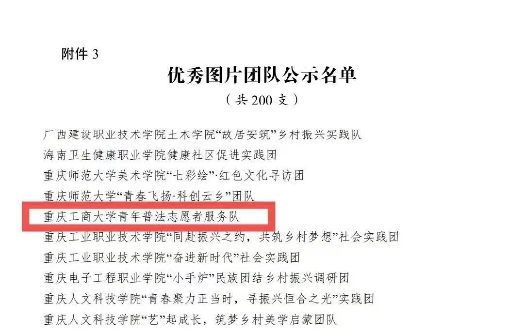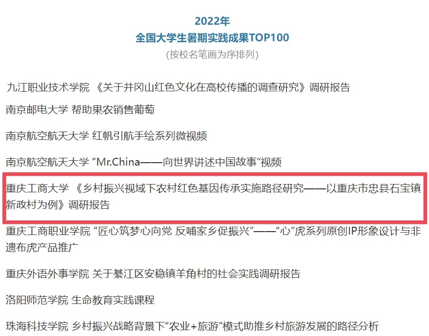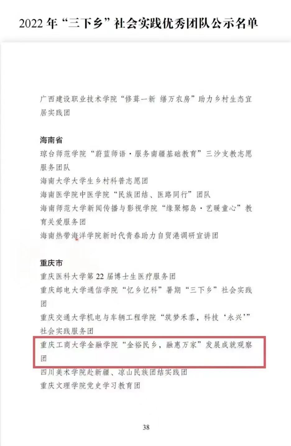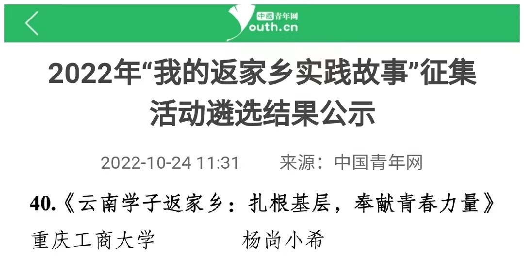 在中央宣传部、中央文明办、教育部、共青团中央、全国学联共同举办的2022年全国大中专学生志愿者暑期文化科技卫生“三下乡”社会实践活动评选中,365官网金融学院“金裕民乡,融惠万家”发展成就观察团荣获2022年“三下乡”社会实践活动全国优秀团队。在共青团中央青年发展部、中国青年报、中国青年网共同举办的2022年“镜头中的三下乡”征集活动中,校团委荣获“全国优秀组织单位”奖项,金融学院“金裕民乡,融惠万家”发展成就观察团、国际商学院暑期“三下乡”赴新疆民族团结实践团荣获“全国优秀视频团队”奖项,法学与社会学学院青年普法志愿者服务队荣获“全国优秀图片团队”奖项,通识学院“聚焦大思政:铸民族同心,促乡村振兴”民族团结实践团荣获“全国优秀文字团队”奖项。在共青团中央青年发展部、中国青年报、中国青年网共同举办的2022年“我的返家乡实践故事”征集活动中,法学与社会学学院学子杨尚小希作品《云南学子返家乡:扎根基层,奉献青春力量》荣获全国优秀作品。在中国青年报社主办的2022年第八届全国大学生暑期实践展示活动中,通识学院聚焦“‘大思政’:铸民族同心,促乡村振兴”民族团结实践团完成的《乡村振兴视域下农村红色基因传承实施路径研究——以重庆市忠县石宝镇新政村为例》调研报告入选2022年全国大学生暑期实践成果百强榜单。在共青团中央青年发展部主办的“一起云支教·携手创未来”全国大学生2022年暑期“返家乡”社会实践专项活动中,365官网荣获“突出贡献高校”奖。