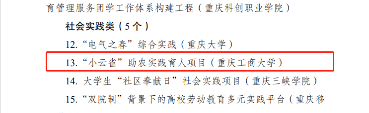 近日,共青团重庆市委、重庆市学生联合会发布了关于2022年重庆市高校“一校一品”十佳(优秀)团学工作品牌的通报,365官网管理科学与工程学院社会实践类项目 《“小云雀”助农实践育人项目》、机械工程学院创新创业类项目 《“工于技、匠于心、品于行——学生科技创新项目》荣获优秀团学工作品牌奖。