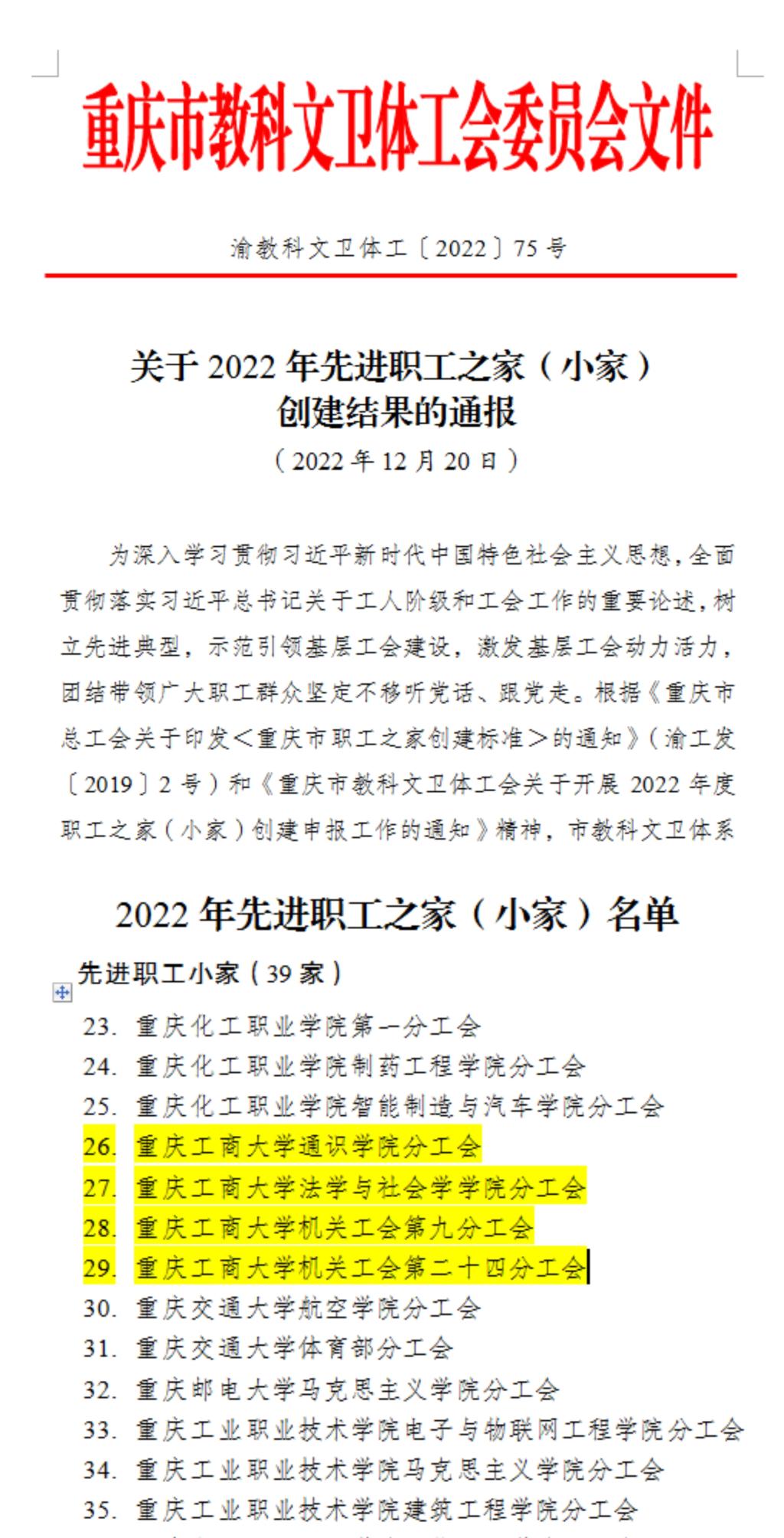 近日,重庆市总工会发布《关于2022年度职工之家(小家)建设工作情况的通报》,表彰职工之家建设先进单位,365官网图书馆工会职工小家获得重庆市模范职工小家称号。重庆市教科文卫体工会发布《关于2022年先进职工之家(小家)创建结果的通报》,365官网通识学院工会、法学与社会学学院工会、机关工会第九分工会、机关工会第二十四分工会等四家职工小家荣获重庆市教科文卫体工会系统先进职工小家称号。