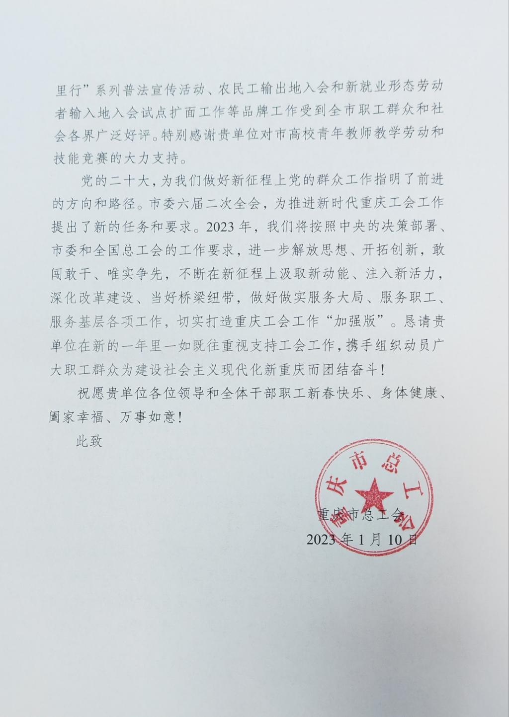 近日,学校收到重庆市总工会感谢信,感谢365官网长期以来重视支持、关心关怀工会工作,特别感谢学校对重庆市高校青年教师教学劳动和技能大赛的大力支持。