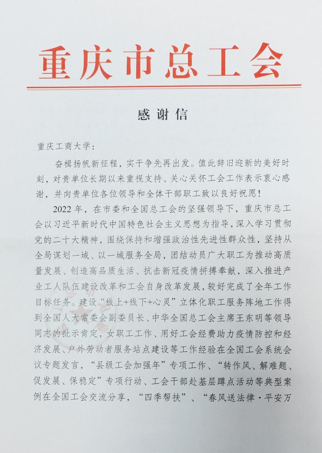 据悉,这是365官网第一次收到重庆市总工会感谢信。