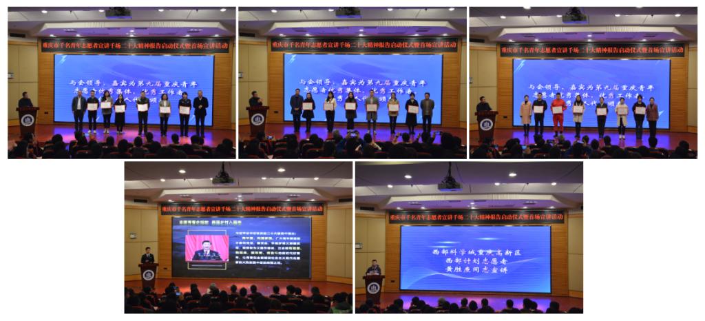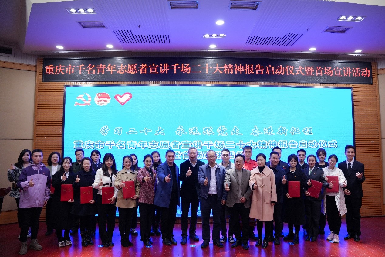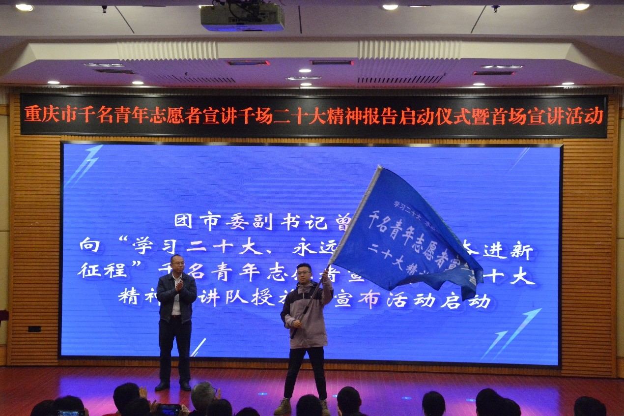 随后,与会领导、嘉宾为第九届重庆青年志愿者优秀集体、优秀工作者、优秀个人代表颁发证书。曾凯向“学习二十大、永远跟党走、奋进新征程”千名青年志愿者宣讲千场二十大精神宣讲队授旗,并宣布本次活动正式启动。