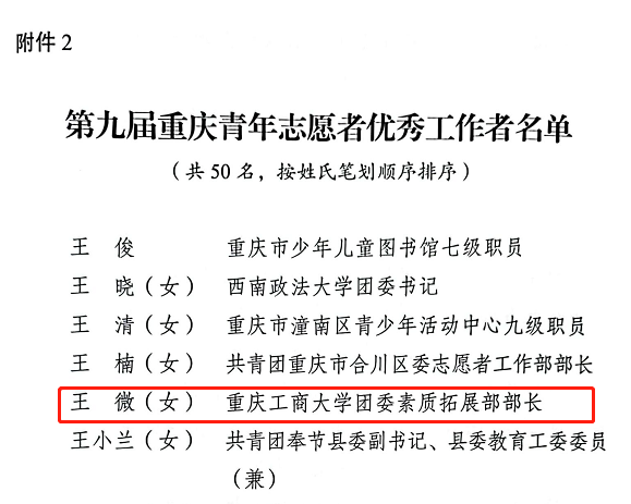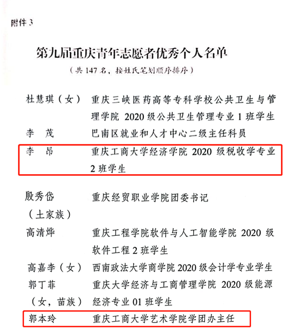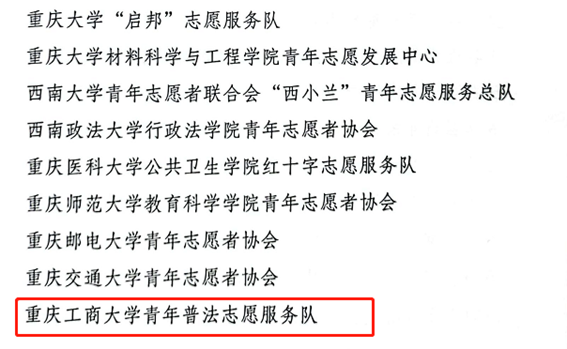 365官网法学与社会学学院青年普法志愿服务队获评第九届重庆青年志愿者优秀集体,校团委王微老师获评优秀工作者,艺术学院郭本玲老师、经济学院2020级税收学专业2班学生李昂获评优秀个人。
