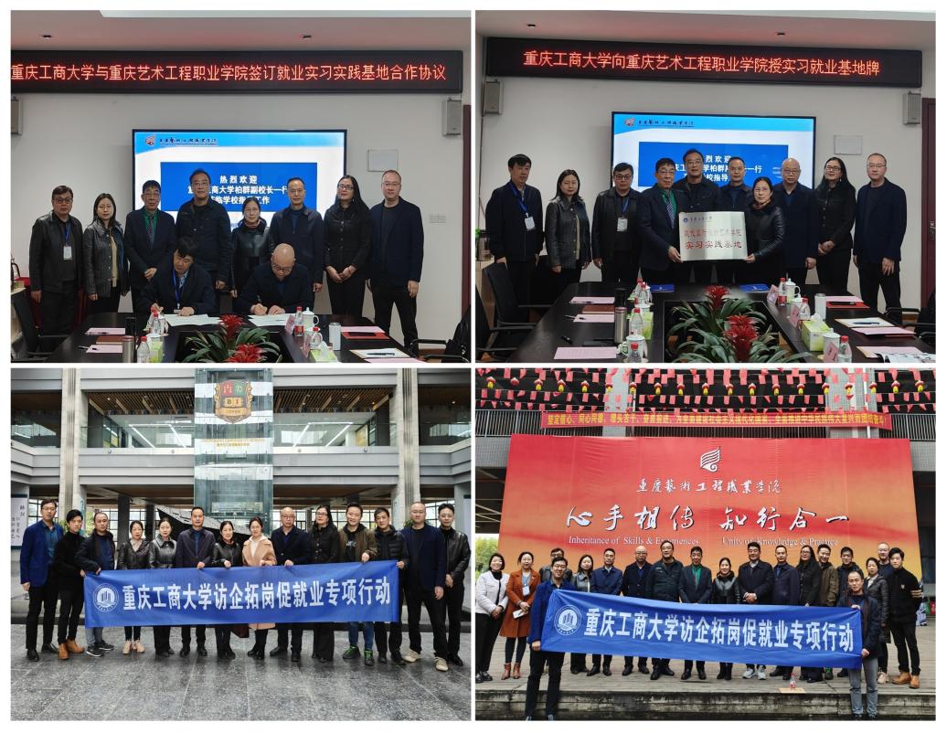 3月27日下午,学校党委常委、副校长柏群带领艺术学院、现代国际设计艺术学院班子成员及科室主任一行到铜梁区重庆传媒职业学院、重庆艺术工程职业学院开展合作洽谈及访企拓岗促就业专项行动。重庆传媒职业学院、重庆艺术工程职业学院董事长,365官网校友会副会长周勃,重庆传媒职业学院党委书记高天红、校长柳卫东,重庆艺术工程职业学院校长许锡宾等带领两校相关领导及相关部门、院系负责人参与了合作洽谈。