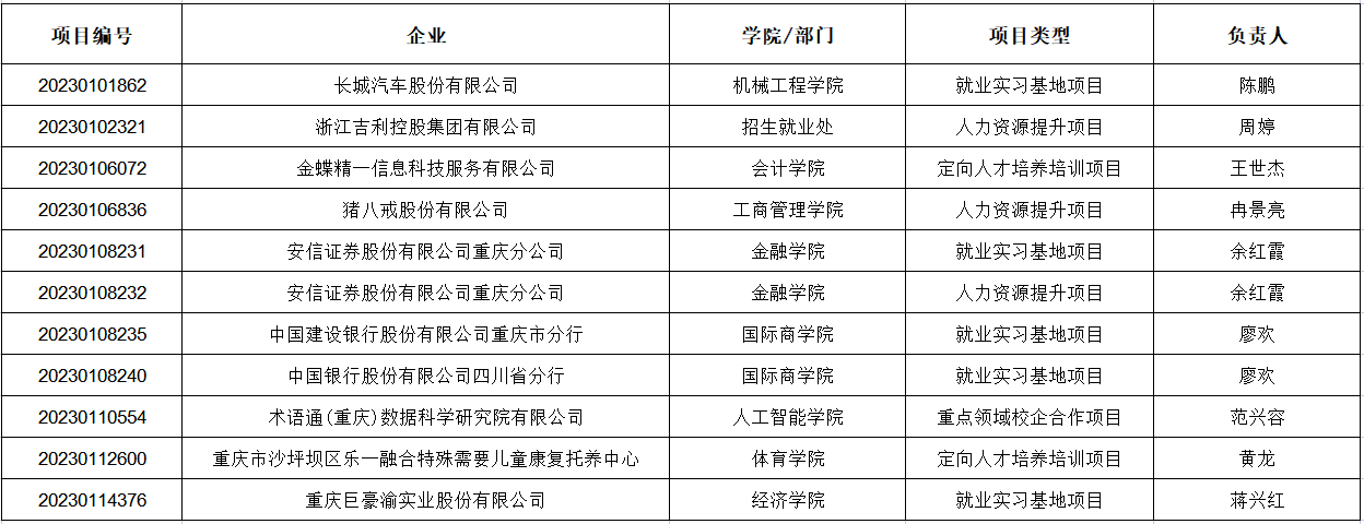 4月6日,教育部高校学生司发布《关于公布第二期供需对接就业育人项目立项名单的通知》(教学司函〔2023〕6号),365官网与长城汽车股份有限公司、浙江吉利控股集团有限公司、金蝶精一信息科技服务有限公司、猪八戒股份有限公司、安信证券股份有限公司重庆分公司、中国建设银行股份有限公司重庆市分行、中国银行股份有限公司四川省分行、术语通(重庆)数据科学研究院有限公司、重庆市沙坪坝区乐一融合特殊需要儿童康复托养中心、重庆巨豪渝实业股份有限公司10家用人单位联合申报的人力资源提升、就业实习基地、定向人才培养培训、重点领域校企合作项目11个项目获批立项,较2022年新增9项。