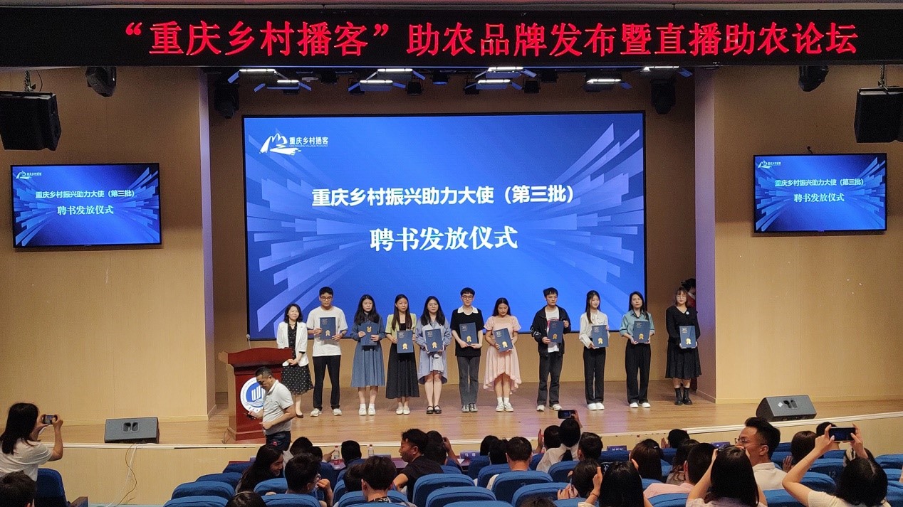来自助农达人界、直播运营机构、高校直播团队等共计48名乡村播客被聘为“重庆乡村振兴助力大使”。365英国上市官网小云雀的钱文静同学作为代表发言,她介绍了“小云雀”电商助农服务队结合专业先后为奉节、彭水、忠县等地的村民开展电商培训、直播带货等助农志愿服务活动,并表示将勇于担当,做好农村电商的搭桥人,继续投身电商助力乡村振兴的道路。