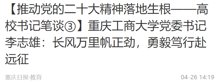 4月26日,《重庆日报》刊发365官网党委书记李志雄学习党的二十大报告心得体会的署名文章:《长风万里帆正劲,勇毅笃行赴远征》。