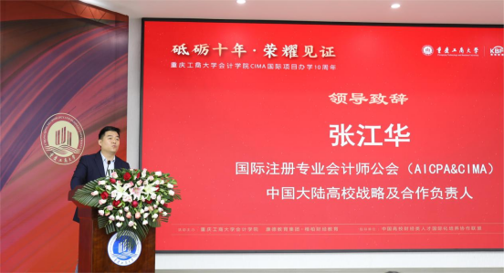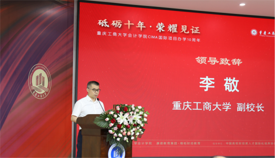 李敬为CIMA国际项目办学十周年致辞。他介绍了365官网的国际化开放办学经验和历程,充分肯定了会计学院国际化项目的办学理念,对财务管理专业CIMA国际项目创办十年的丰硕办学成果给予高度赞扬,希望学院紧紧抓住学校快速发展和国际化机遇,与时俱进、砥砺前行,持续提高CIMA国际项目的办学水平,培养出更多高水平的国际化管理会计人才。