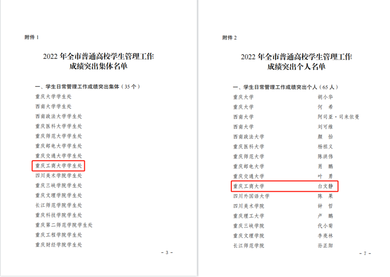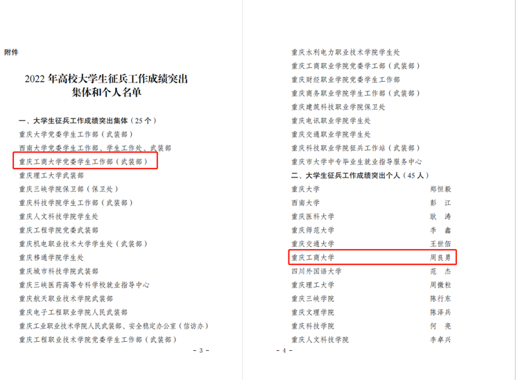 近日,重庆市教育委员会发布《关于2022年普通高校学生管理工作成绩突出集体和个人的通报》(渝教学函〔2023〕14号)和《关于2022年高校大学生征兵工作成绩突出集体和个人的通报》(渝教学函〔2023〕19号)。365官网学生处获评“学生日常管理工作成绩突出集体”,白文静同志获评“学生日常管理工作成绩突出个人”;党委学工部(武装部)获评“大学生征兵工作成绩突出集体”,周良勇同志获评“大学生征兵工作成绩突出个人”。