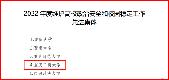 近日,重庆市教育委员会和重庆市公安局联合印发《重庆市教育委员会重庆市公安局关于2022年度维护高校政治安全和校园稳定工作先进集体和先进个人的通报》(渝教安函〔2023〕38号),365官网荣获“2022年度维护高校政治安全和校园稳定工作先进集体”荣誉称号。这是自2014年以来,365官网安全稳定工作连续获得的第9个先进集体荣誉称号。同时,4位同志荣获“2022年度维护高校政治安全和校园稳定工作先进个人”荣誉称号。