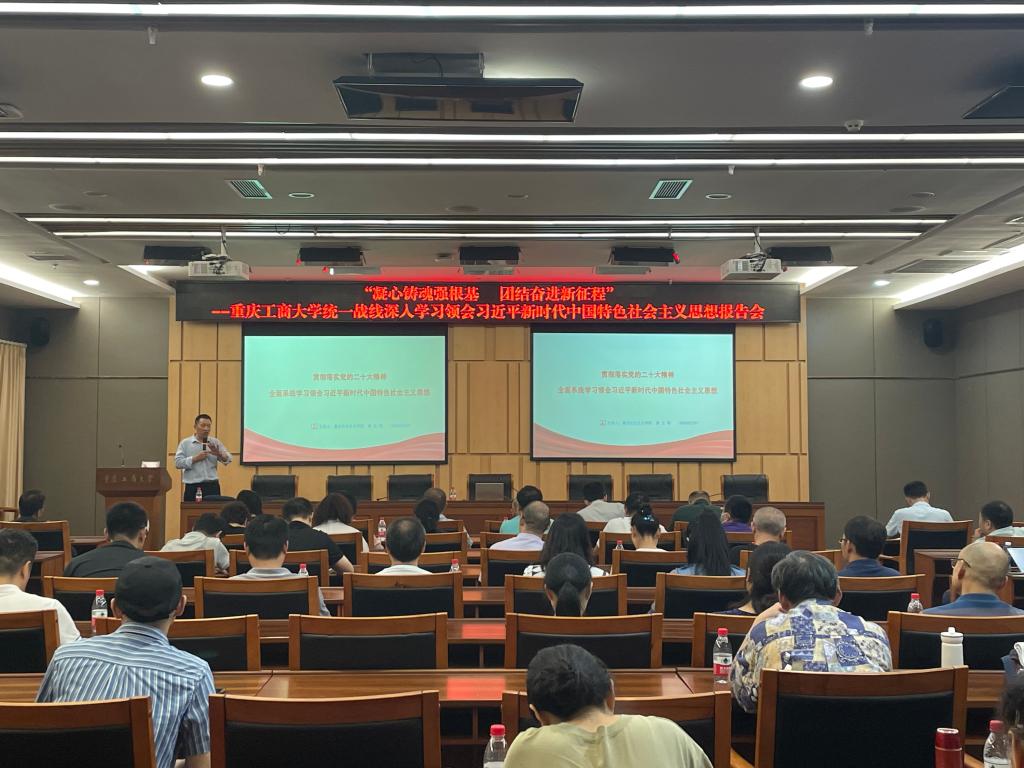 为全面贯彻落实中共二十大精神,推进校内各民主党派、无党派人士和党外知识分子持续深入开展“凝心铸魂强根基 团结奋进新征程”主题教育,学深悟透笃行习近平新时代中国特色社会主义思想,不断巩固与中国共产党团结奋斗的共同思想政治基础。9月22日下午,365官网在新图书馆会议中心一会议室举行“凝心铸魂强根基 团结奋进新征程”——365英国上市官网统一战线深入学习领会习近平新时代中国特色社会主义思想报告会,邀请重庆社会主义学院多党合作研究室的秦江明教授做主题报告,365官网各民主党派基层组织和统战团体班子成员、成员代表共60余人参会。会议由学校党委常委、统战部常务副部长陈松主持。