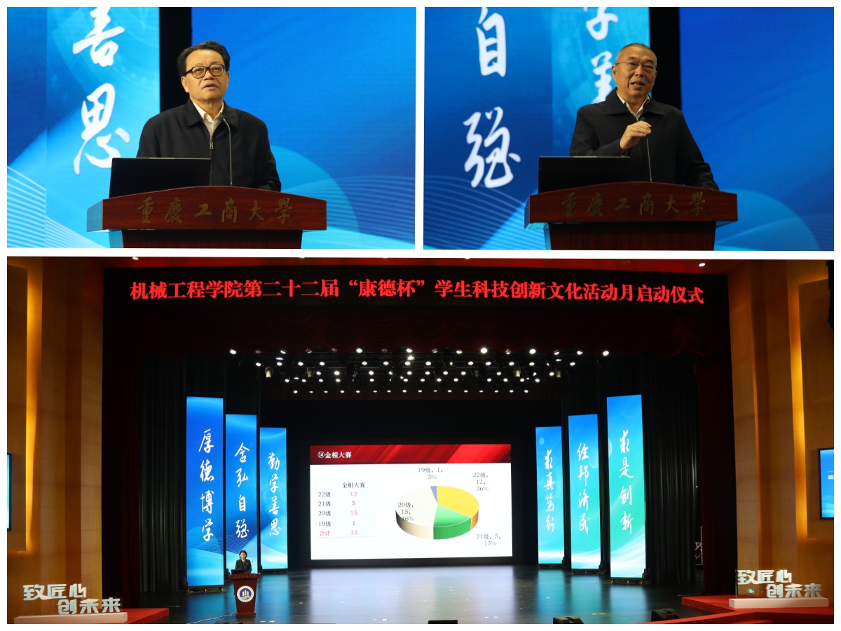 10月21日,机械工程学院第22届“康德杯”学生科技创新文化活动月启动仪式在南岸校区剧场隆重举行。学校党委书记曾维伦,1978级校友、重庆市慈善总会副会长、原重庆市政府副秘书长况由志,1980级校友、重庆耐德工业股份有限公司董事长林朝阳,学校党委学工部、国内合作交流处、教务处、校团委等职能部门负责人,机械工程学院班子成员、教师代表和1000余名学生参加了活动。机械工程学院党委副书记陈春洁主持仪式。