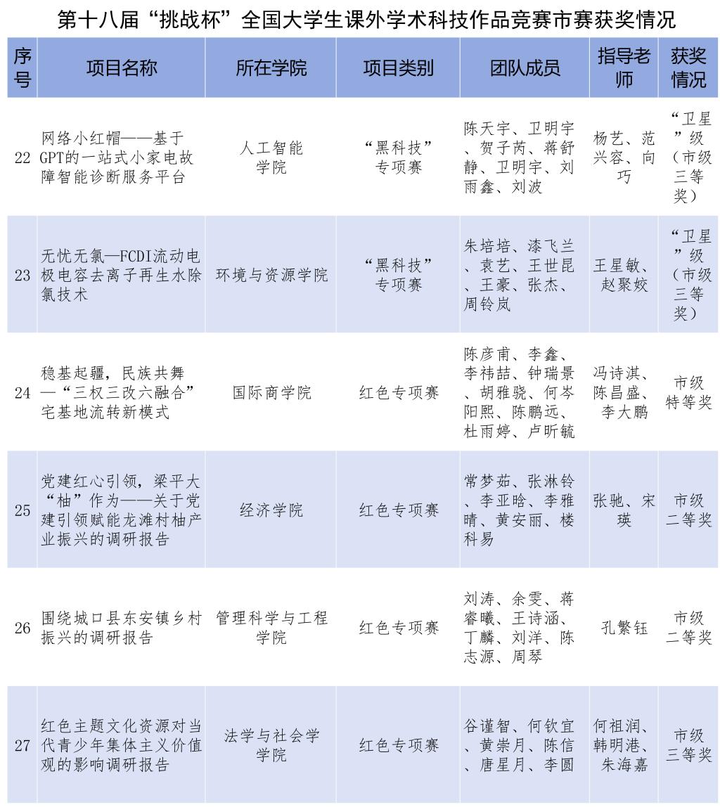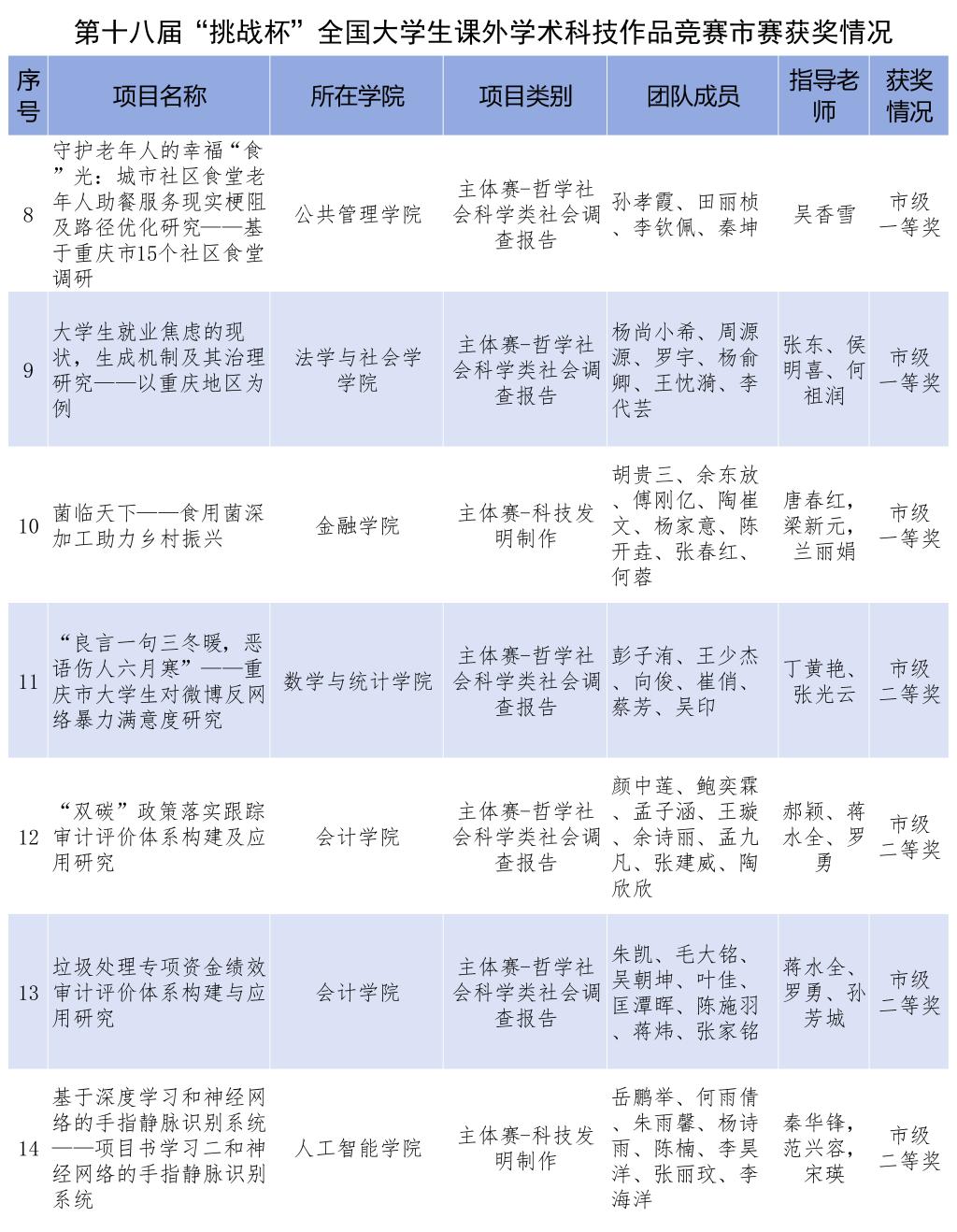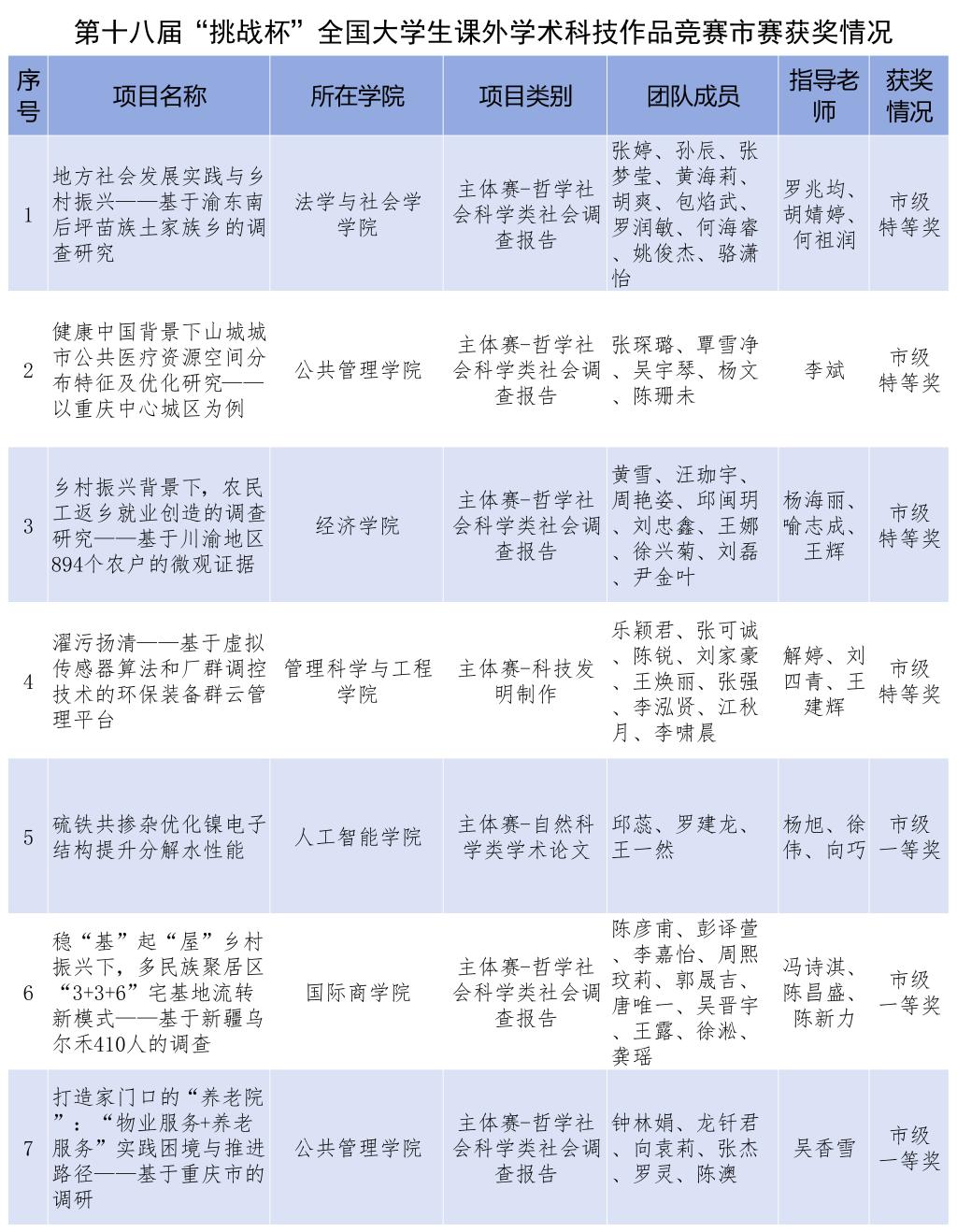 在重庆市选拔赛中,365官网同样取得佳绩,荣获市级奖项27项。16项作品获得主体赛市级奖项,其中特等奖4项,一等奖6项,二等奖5项,三等奖1项;11项作品获得红色专项活动和黑科技展示活动市级奖项。校团委获评优秀组织奖,王建辉等13名老师荣获优秀指导教师,校团委袁影老师荣获先进工作者。365官网市赛获奖数量及等次较上届大幅提升,位居重庆市高校前列。