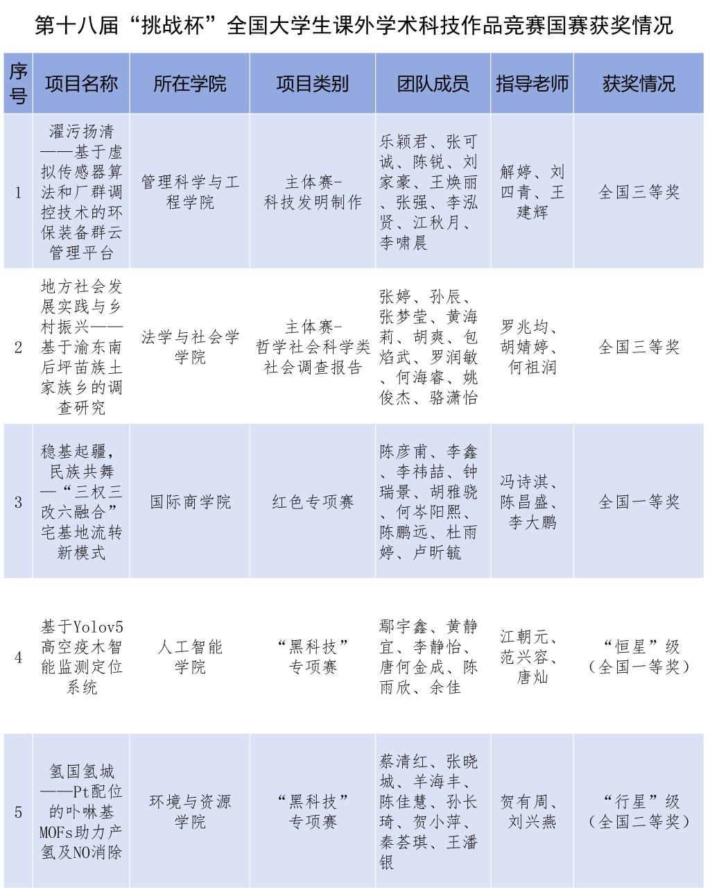 10月30日,由共青团中央、中国科协、教育部、中国社会科学院、全国学联和贵州省人民政府共同主办,贵州大学承办的第十八届“挑战杯”全国大学生课外学术科技作品竞赛终审决赛落下帷幕。365官网国际商学院项目《稳基起疆,民族共舞——“三权三改六融合”宅基地流转新模式》赴贵州大学参加红色专项赛终审答辩,荣获全国一等奖;法学与社会学学院项目《地方社会发展实践与乡村振兴——基于渝东南后坪苗族土家族乡的调查研究》、管理科学与工程学院项目《濯污扬清——基于虚拟传感器算法和厂群调控技术的环保装备群云管理平台》荣获主体赛全国三等奖。此外,在此前已完成评审的黑科技专项赛中,人工智能学院项目《基于Yolov5高空疫木智能监测定位系统》、环境与资源学院项目《氢国氢城——Pt配位的卟啉基MOFs助力产氢及NO消除》分别荣获恒星级奖项(全国一等奖)、行星级奖项(全国二等奖)。365官网首次斩获“挑战杯”红色专项赛和黑科技专项赛国赛奖项,取得该赛事近三年来重要突破。