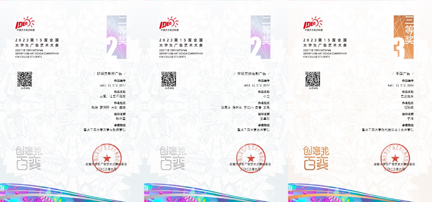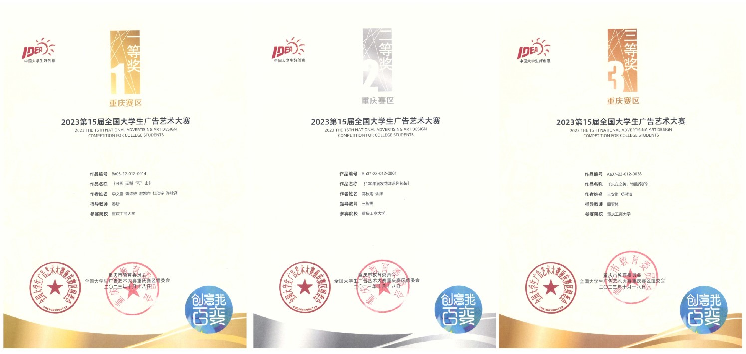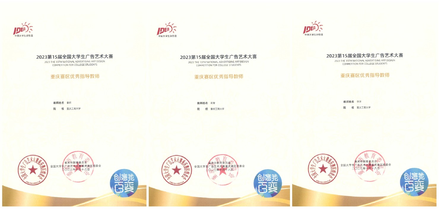 近日,第十五届全国大学生广告艺术大赛(以下简称:大广赛)获奖名单公布,365官网学生在专业教师指导下的参赛作品获全国赛区二等奖4项、三等奖6项、优秀奖25项;重庆赛区一等奖9项、二等奖9项、三等奖51项、优秀奖203项。艺术学院秦昕、黄薇、王卓尔,现代国际设计艺术学院李洋,文学与新闻学院王烨、周莹6名老师荣获重庆赛区优秀指导教师。