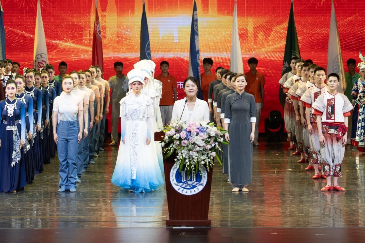 参演学生代表西南大学吴珂仪在发言中代表所有参赛选手感谢重庆市教委打造的高水平艺术学习平台,让同学们有机会在艺术的殿堂里展现青春风采。她谈到,大学生艺术展演是当代大学生追求艺术、传递友谊、成就梦想的起点。她结合参演节目分享自己的体会和收获,并号召青年朋友们牢记习近平总书记谆谆教诲,厚植家国情怀,涵养进取品格,与时代同向,与祖国同行,在重庆市第七届大学生艺术展演的舞台上舞动青春的姿态、吟唱青春的赞歌,绽放出最炽热、最绚丽的光芒。