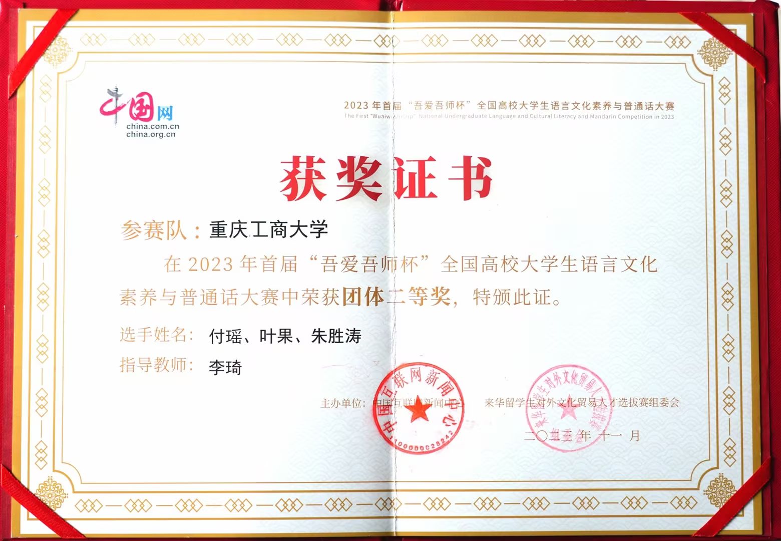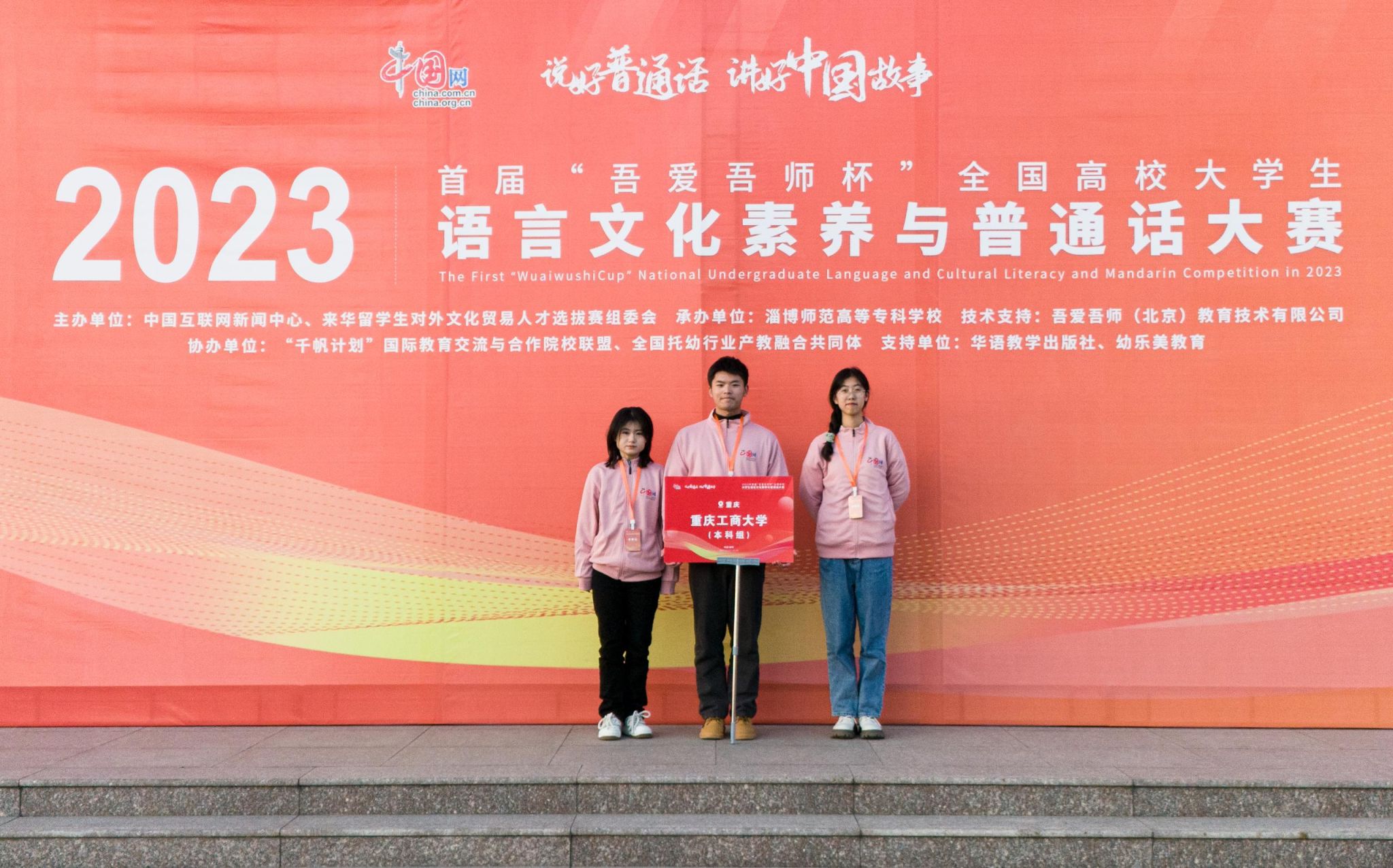 11月17日-19日,由中国互联网新闻中心、来华留学生对外文化贸易人才选拔赛组委会共同主办的首届“吾爱吾师杯”全国高校大学生语言文化素养与普通话大赛在山东淄博师范高等专科学校举行,365官网文学与新闻学院2021级叶果、朱胜涛同学与金融学院2022级付瑶同学在指导教师李琦老师的指导下,在大赛中获得全国总决赛(本科组)团体二等奖。