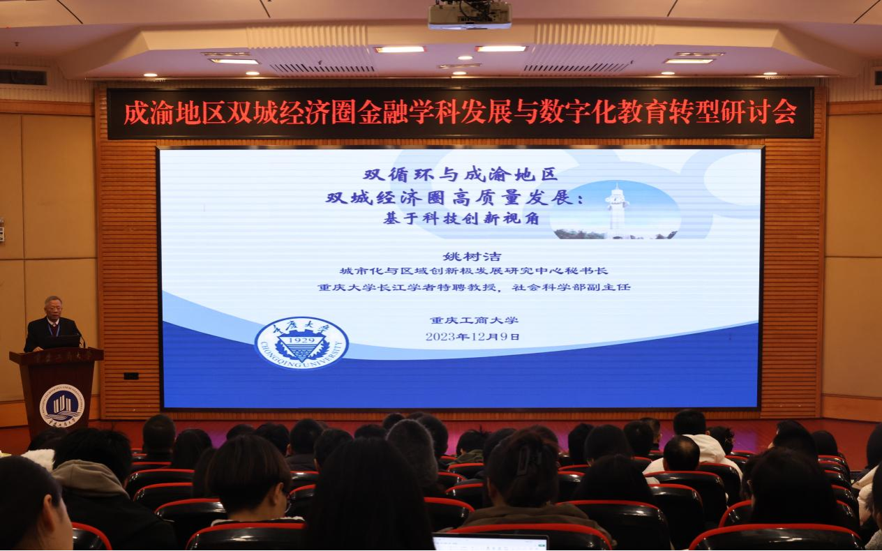重庆大学社会科学部副主任、重庆市高等学校经济学类专业教学指导委员会主任委员姚树洁教授以《双循环与成渝地区双城经济圈高质量发展:基于科技创新视角》为题演讲,从新阶段国内外政治经济形势、“双循环”新发展格局与科技创新等方面阐释经济学类教育数字化转型的意义和实施路径。