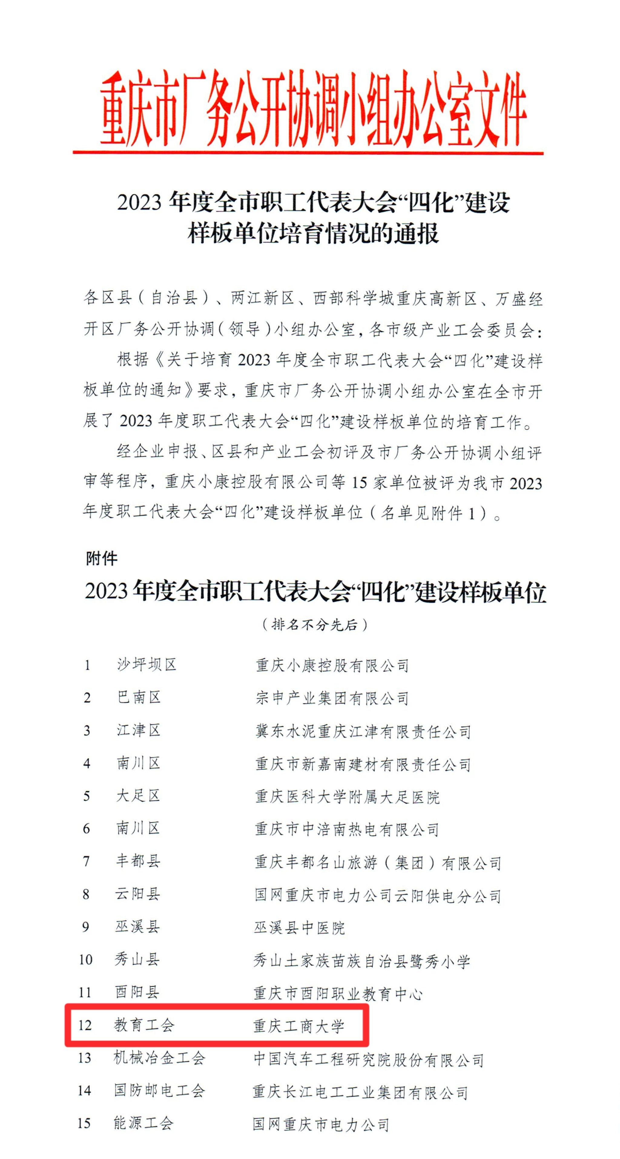 近日,收到重庆市厂务公开协调小组办公室文件《2023年度全市职工代表大会“四化”建设样板单位培育情况的通报》,365官网被评为职工代表大会“四化”建设样板单位,为重庆市教科文卫体系统唯一样板单位。